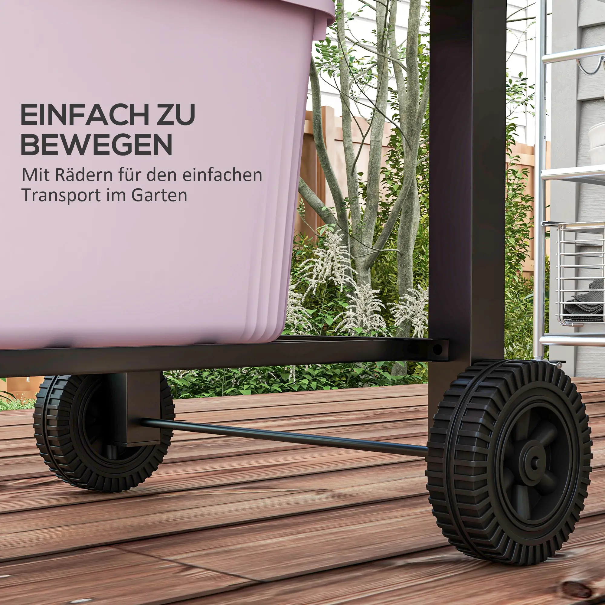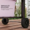 Mobiliteit eenvoudig: Onze grille is uitgerust met twee wielen waarmee je hem moeiteloos precies kunt verplaatsen waar je hem nodig hebt. Productdetails: Totale afmetingen: 124L x 66B x 112H cm. Laadcapaciteit: 10 kg (zijschil), 20 kg (onderste plank)