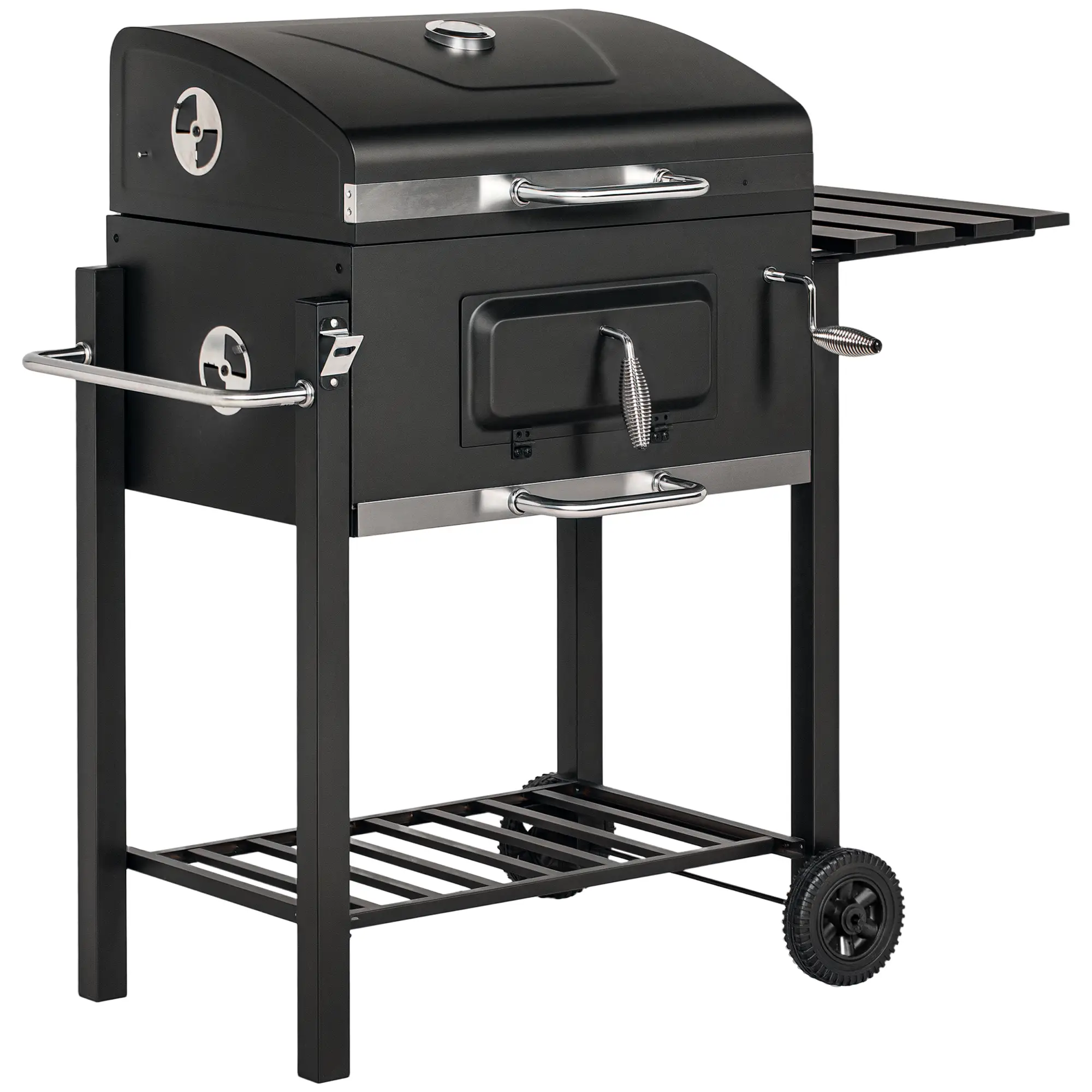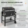 Handige temperatuurregeling: Het koolstofcompartiment is in hoogte verstelbaar door aan de handkrukas te draaien, en het koolstof kan gemakkelijk worden bijgevuld via de voorklep. Het grilldeksel helpt de warmte vast te houden, en de verstelbare ventilatieopeningen en thermostaat op het deksel maken het mogelijk om de interne temperatuur te regelen
