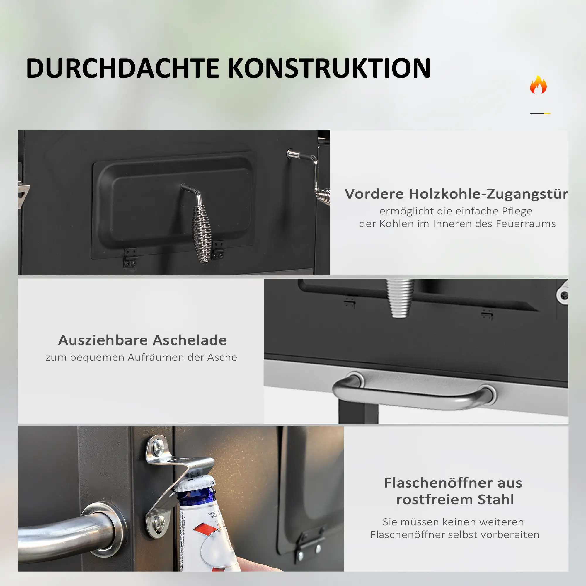 Verfijnd ontwerp: De houtskoolgrill is uitgerust met een flesopener, de roestvrijstalen handvatten zijn hittebestendig en beschermen veilig tegen brandwonden. De uittrekbare bodem vangt de as op en is na het grillen gemakkelijk schoon te maken.