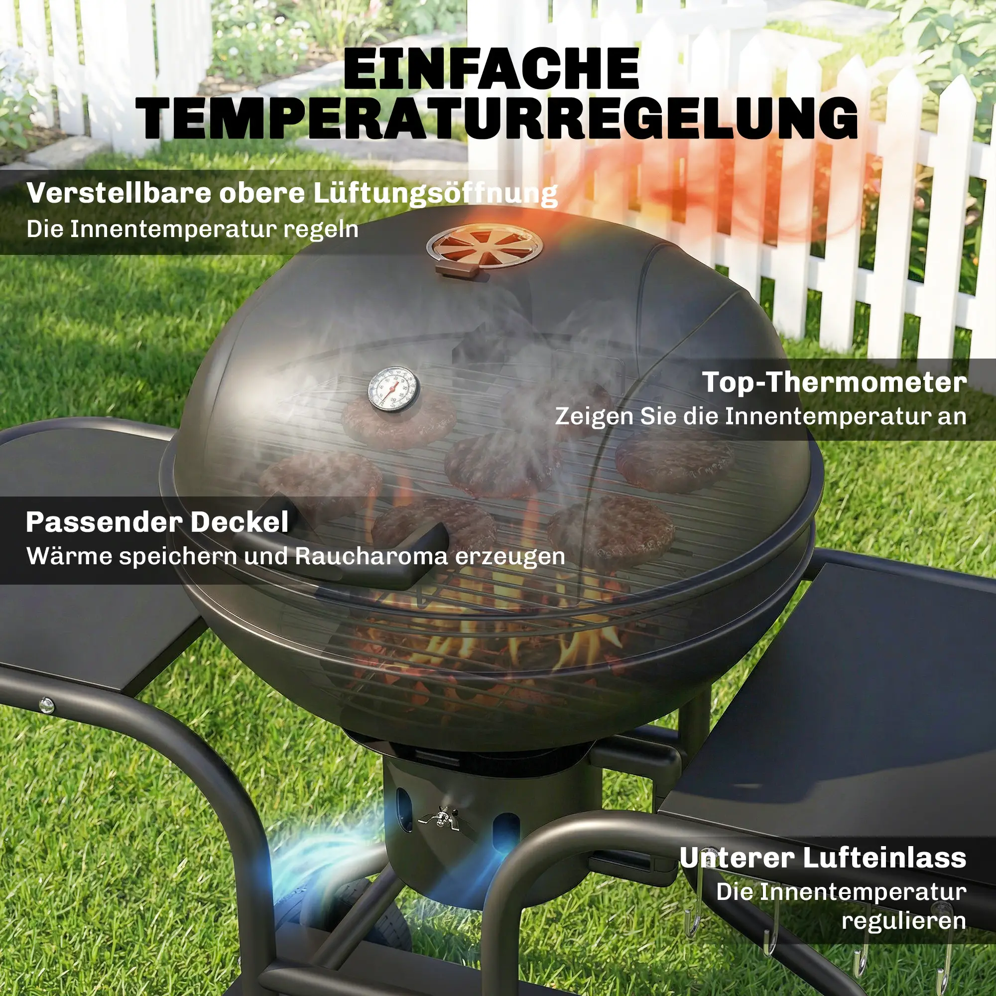 Uitgebreid werkstation: Twee vaste bijzettafels van 38,5 x 44,5 cm en een onderste plank van 65 x 44,5 cm bieden ruime ruimte voor sauzen, bestek en houtskool. Dit houdt je kettle grill altijd netjes en stressvrij.