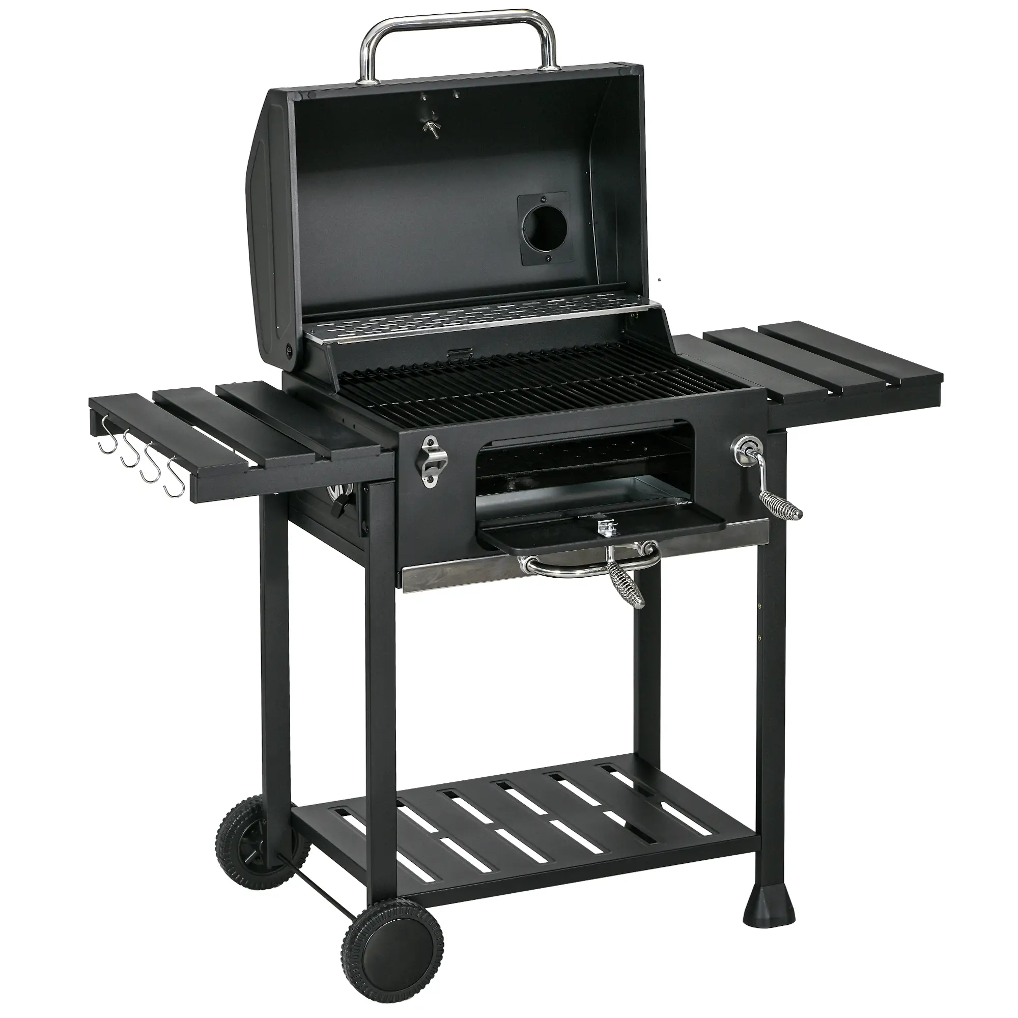 Deze BBQ van HC Huis & Tuin is de ideale keuze voor sociale bijeenkomsten met familie en vrienden buiten. Gemaakt van gegalvaniseerd staal en poedercoat, biedt het het hoogste niveau van betrouwbaarheid en robuustheid. Het luxueuze ontwerp combineert meerdere functies in één grille. Een roestvrijstalen handvat maakt het deksel veilig geopend, terwijl een zijhandvat de hoogte van de houtskoolgrill regelt om de rookintensiteit van het voedsel te regelen.