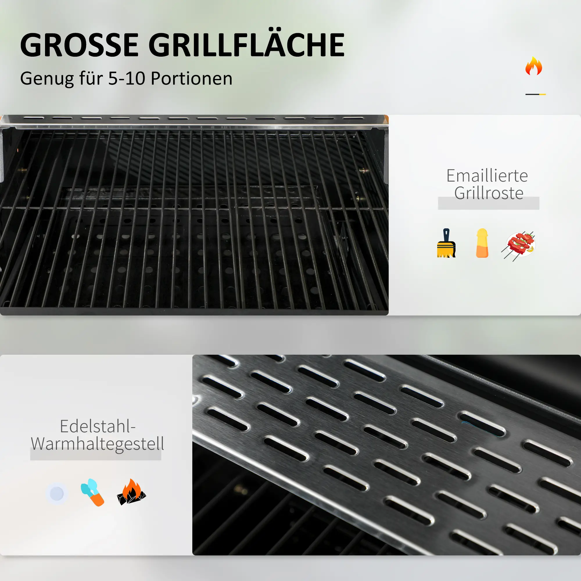 Groot grilloppervlak: Onze houtskoolgrill wordt gekenmerkt door een ruim grilloppervlak van 50 x 34 cm, dat voldoende ruimte biedt om maaltijden voor 5-10 personen te bereiden. Een extra verwarmingsrek maakt het mogelijk om het eten tijdelijk warm te houden. Perfect voor sociale bijeenkomsten met vrienden en familie