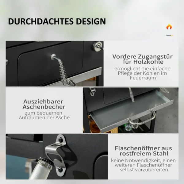 Goed doordachte details: Onze houtskoolgrill met deksel overtuigt met praktische extra’s zoals een geïntegreerde flesopener en verbrandingsvrije roestvrijstalen handvatten. Voor een moeiteloze schoonmaak na het grillen vangt de uitschuifbare aspan de vuile as effectief op
