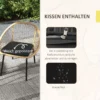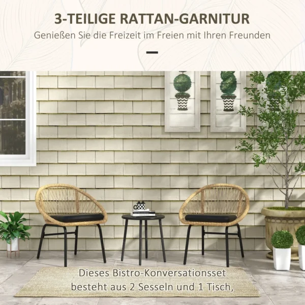 Driedelig set voor gezellige buiten uren: Deze rotan tuinset bevat twee stoelen met armleuningen en een bijpassende ronde tafel. De zacht gevoerde kussens zorgen voor maximaal zitcomfort en nodigen uit om te ontspannen