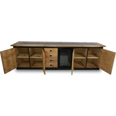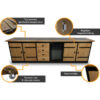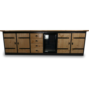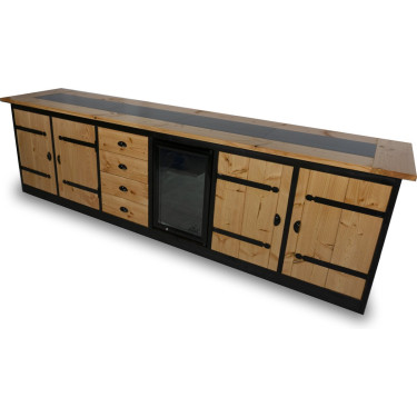 Geniet van ultieme functionaliteit met maar liefst zes panelen, waaronder een handige koelkast van 70 liter (0-10 graden) om uw ingrediënten vers te houden. De robuuste lades en kasten met klassieke zwarte kruishengen zorgen voor een praktische indeling, terwijl de wielen aan de onderzijde het mogelijk maken de keuken eenvoudig te verplaatsen.