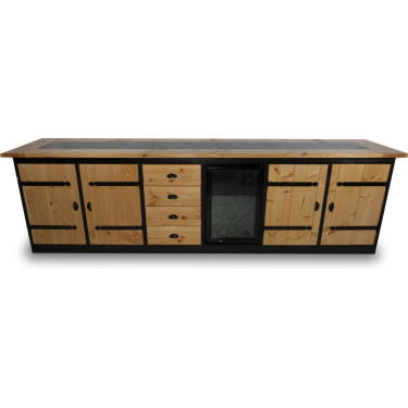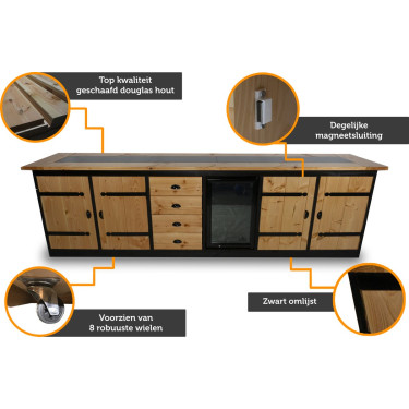 Met een ruim formaat van 301 x 62 x 92 cm biedt de Chatel voldoende ruimte om al uw kookbehoeften te vervullen. Het blad, gemaakt van glad geschaafd douglas hout met ingelegde keramische tegels (30 x 60 cm), is zowel elegant als duurzaam. Dankzij de diep zwart gebeitste omlijsting straalt de buitenkeuken luxe uit in iedere tuinsetting.