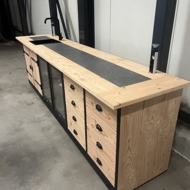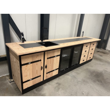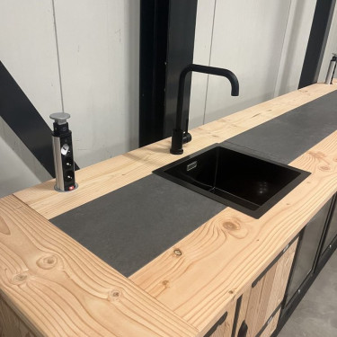 De keuken is vervaardigd van hoogwaardig douglas hout dat aan beide zijden glad is geschaafd, met een dikke en robuuste constructie van 3 cm. Door de diep zwart gebeitste omlijsting en de ingelegde keramische tegels (30 x 60 cm), straalt de keuken pure klasse en duurzaamheid uit.