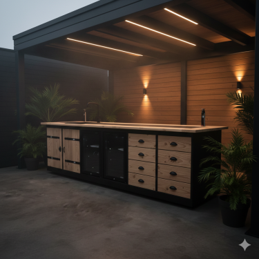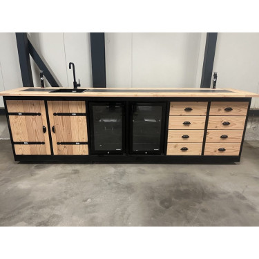 De buitenkeuken heeft 6 panelen, waaronder dubbelzijdige kasten met schappen, 4 extra robuuste lades en voldoende ruimte om al jouw kookspullen netjes te ordenen. Geniet van een keuken die even praktisch als stijlvol is.