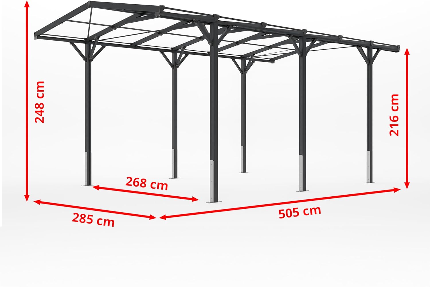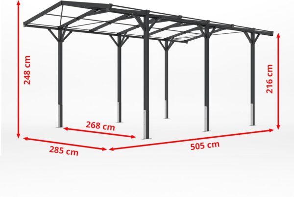 PARKEREN MET JOY – Met afmetingen (L×B×H): 505×285×248 cm is de shelter de perfecte maat voor enkele voertuigen. Met een doorrijhoogte van 216 cm en een doorrijbreedte van 268 cm passen zelfs grotere SUV’s er gemakkelijk in.