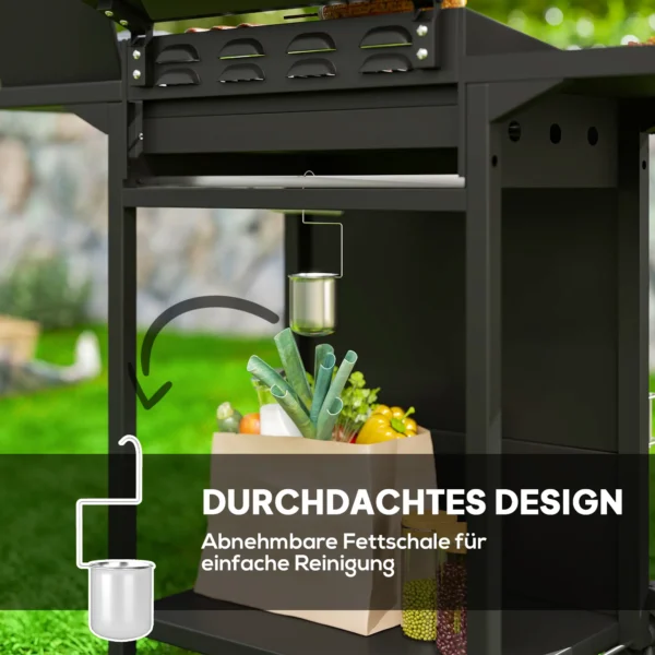 Doordacht ontwerp: Een afneembare vetdruppelbak maakt het gemakkelijk om de grill schoon te maken door druppelend vet op te vangen. Uitgerust met twee robuuste wielen kan de gasgrill eenvoudig van het huis naar de tuin worden geschoven.
