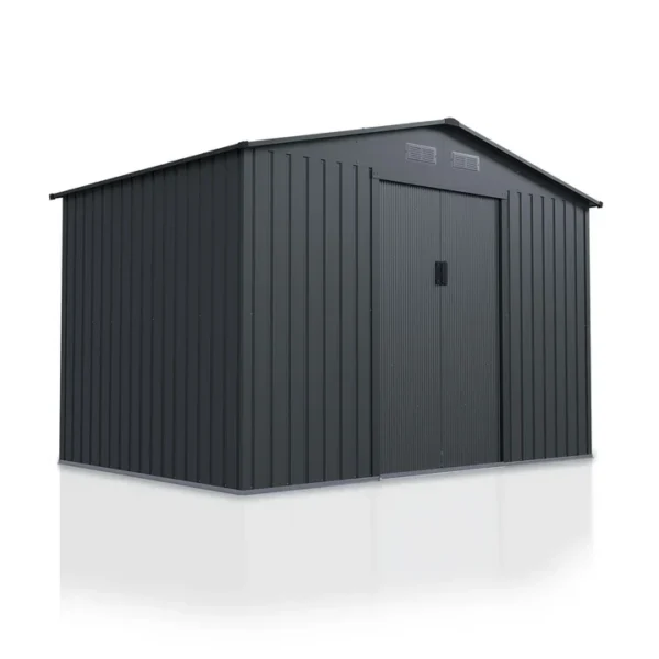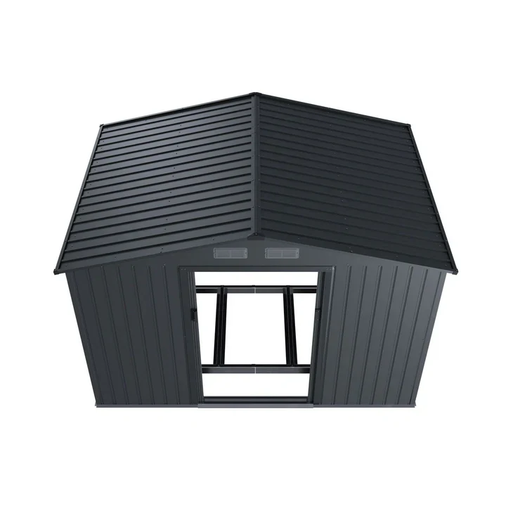 Een gedeelde schuifdeur biedt het hele jaar door toegang tot de gereedschapsschuur. De brede opening van 96 cm maakt het vervoer van omvangrijke spullen mogelijk. De deurgrepen kunnen ook worden voorzien van een slot voor veilige vergrendeling.