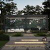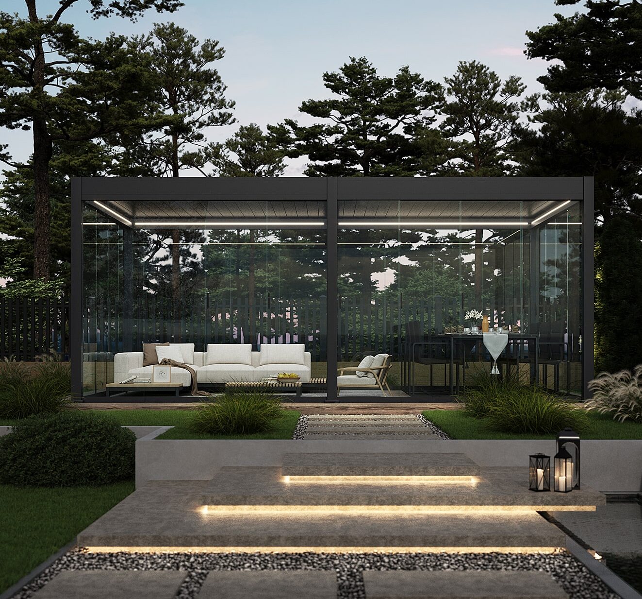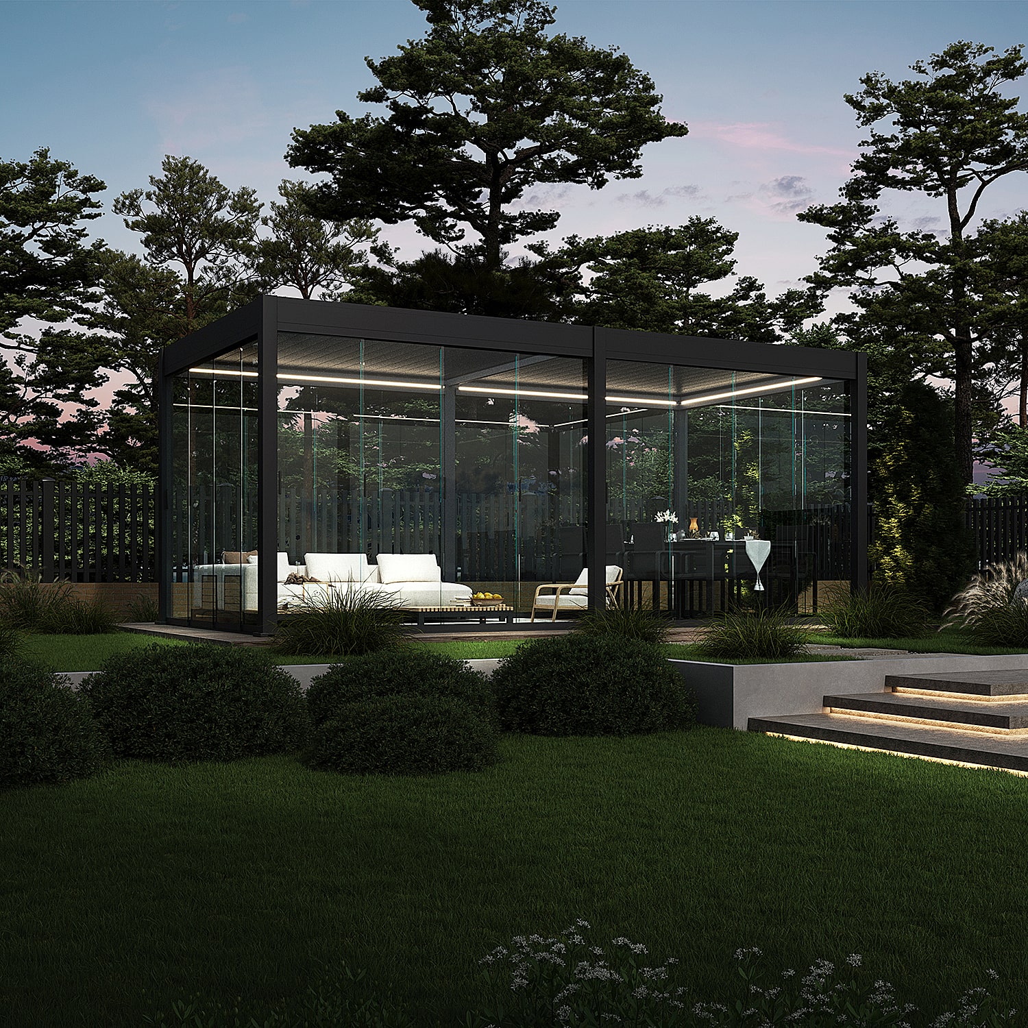 Dankzij het slanke, naadloze ontwerp geniet je van een onbelemmerd uitzicht, terwijl je toch beschut zit tegen wind en regen. De glazen panelen schuiven soepel open en dicht, waardoor je eenvoudig bepaalt hoeveel beschutting of openheid je wilt. Zo creëer je een elegante en flexibele afsluiting die perfect past bij elke tuin of terras.