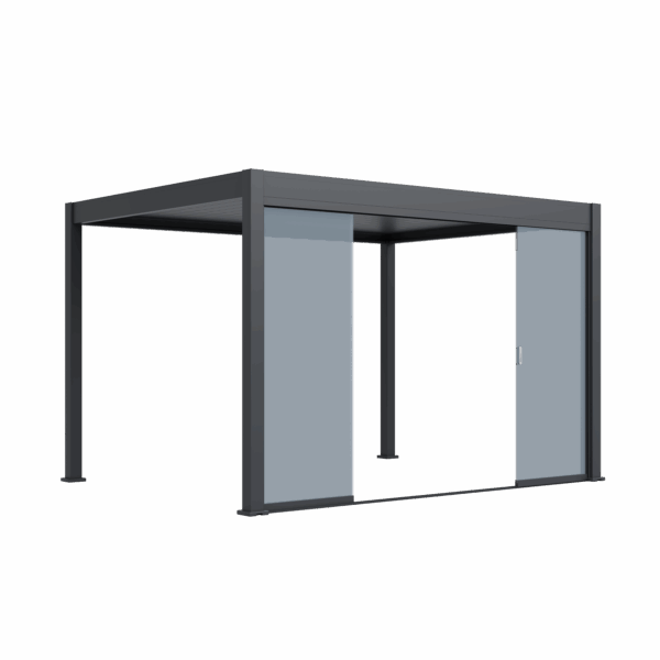 De glazen panelen schuiven soepel open en dicht, waardoor je eenvoudig bepaalt hoeveel beschutting of openheid je wilt. Zo creëer je een elegante en flexibele afsluiting die perfect past bij elke tuin of terras.