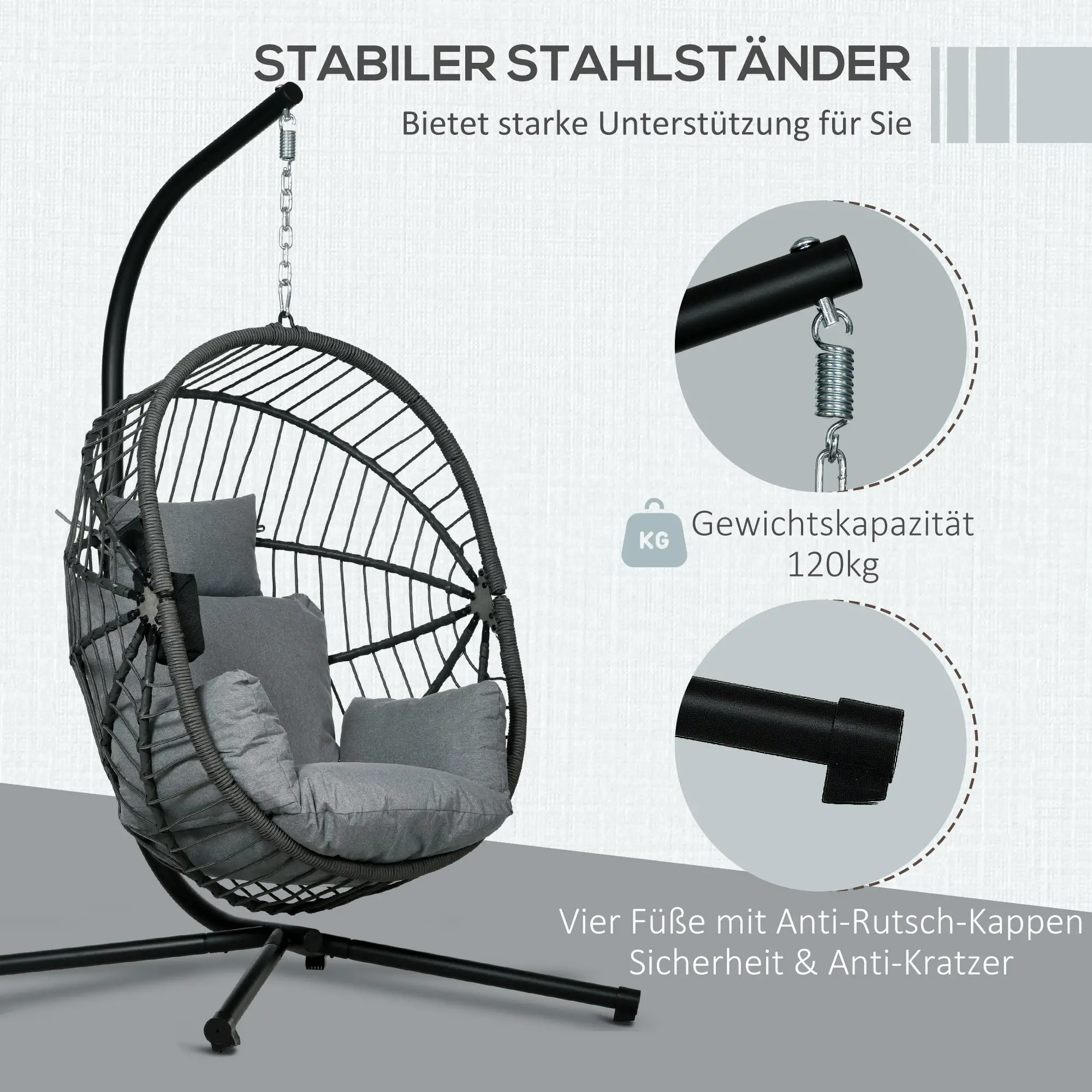 Verstelbaar stalen frame: Het poedergecoate stalen frame en een X-vormige basis met voetpads kunnen tot 120 kg dragen. Met een verstelbare ketting kun je de hoogte van de buitenschommel aanpassen