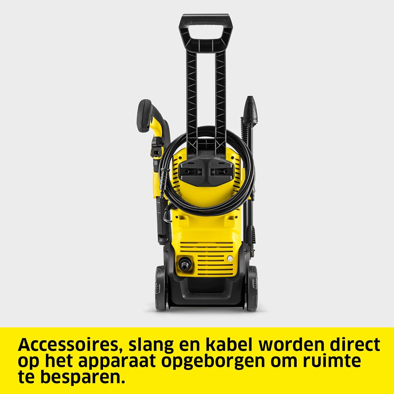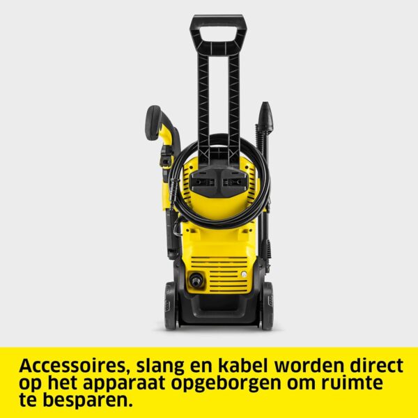 Praktische functies: Dankzij de uitschuifbare telescoopgreep is de K 2 Premium FJ gemakkelijk te verplaatsen. Kabel, spuitlansen en hogedrukpistool worden netjes opgeborgen in de geïntegreerde houders