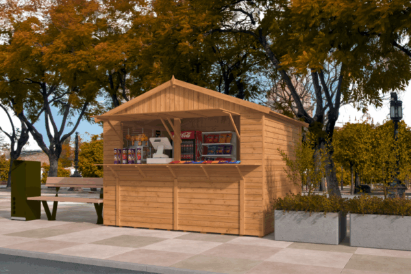 Deze houten Kiosk Fabienne van Vuren hout in de afmeting van 308 x 243 x 251 cm is reeds geïmpregneerd voor een langere levensduur en wordt standaard geleverd inclusief houten vloer, fundering en bevestigingsmateriaal. Deze geïmpregneerde houten marktraam bestaat uit voorgemonteerde wanden met een wanddikte van 16 mm en is daarmee eenvoudig op te bouwen. Kortom, perfect voor de handige doe-het-zelver. De nokhoogte van deze traditionele geïmpregneerde houten kraam bedraagt ca. 251 cm.