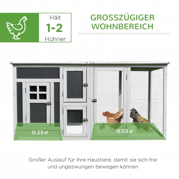 Ruim ontwerp: Met een oppervlakte van 1,05 m² biedt dit kippenhok een hoofdhuis met zitstok, een loopverblijven en een nestkast, waardoor 1–2 kippen, eenden of konijnen genoeg ruimte hebben om te bewegen, zitten en verkennen in een comfortabele omgeving.