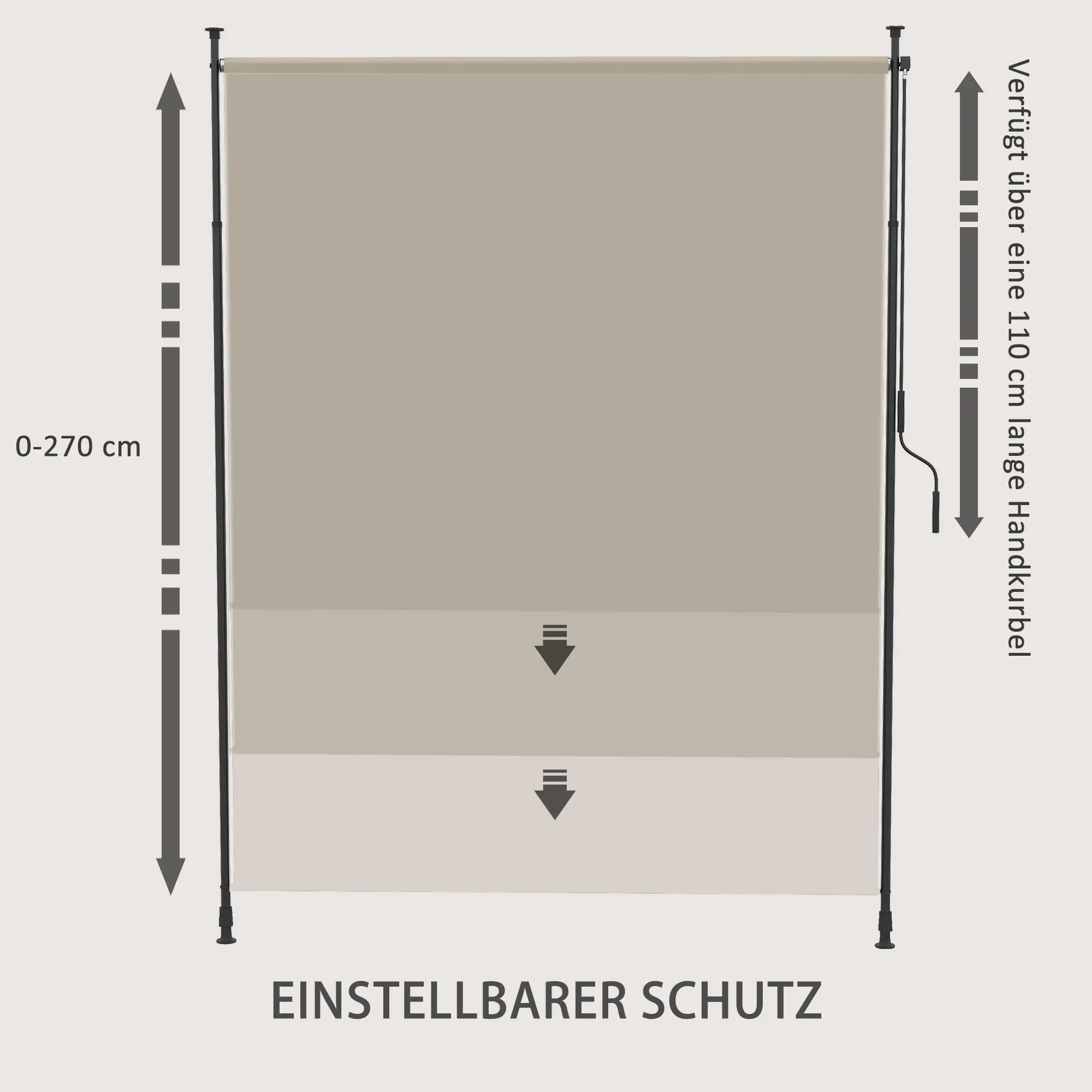Intrekbaar: Dankzij de 120 cm lange handkrukas kan de balkonluifel zachtjes en stil worden uitgestrekt van 0 tot 270 cm om aan uw zon- of schaduwbehoeften te voldoen.