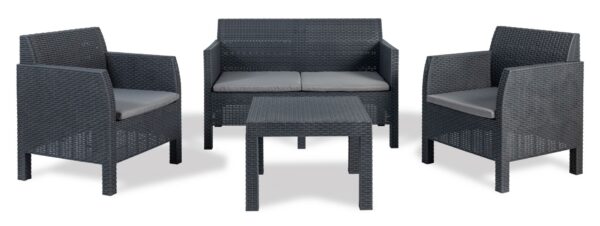 Geniet heerlijk in je eigen tuin van deze HC Huis & Tuin Mathilde lounge set. Deze set bestaat uit 2 ruime stoelen, een 2 persoons bank en een tafel. De bank en de stoelen zijn voorzien van een heerlijk zitkussen voor optimaal zitcomfort. De stoelen monteer je eenvoudig, zonder dat je daar extra gereedschap voor nodig hebt.