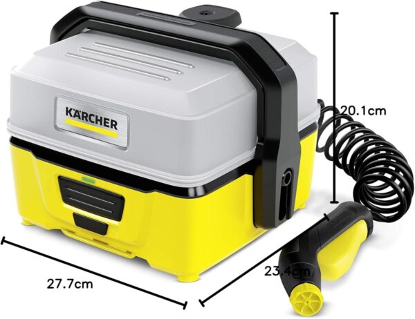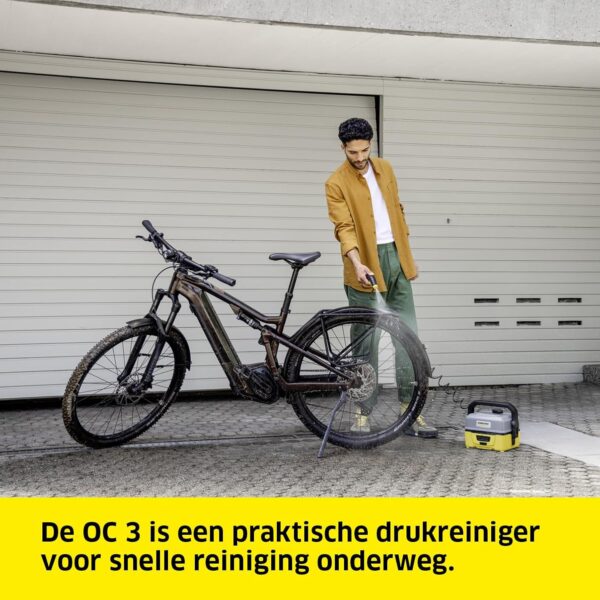 Kärcher drukreiniger OC 3 Snelle reiniging voor onderweg. De mobiele drukreiniger OC 3 van Kärcher is altijd bij de hand als je deze nodig hebt: het accu-apparaat heeft geen stroom- of wateraansluiting nodig en is dus ideaal voor een snelle tussentijdse reiniging onderweg. De OC 3 reinigt bijvoorbeeld fietsen, schoenen of de kinderwagen na een uitstapje, zodat er geen vuil mee de auto in wordt genomen. De lange accu levensduur, de efficiënte vlakstraalsproeier, het waterreservoir van 4 liter en de praktische spiraalslang maken het gebruik kinderspel.
