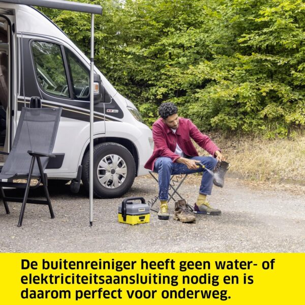 Drukreiniger voor onderweg: De mobiele lagedrukreiniger met watertank van 4 liter en Lithium-Ion-accu heeft geen stroom- of wateraansluiting nodig en is ideaal om mee te nemen
