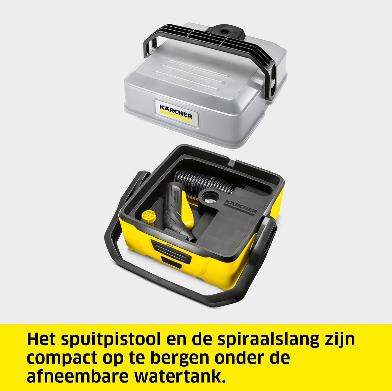 Alles bij de hand: De spiraalslang met het spuitpistool wordt opgeborgen onder de afneembare, waterdichte tank. Hierdoor is de mobiele reiniger OC 3 praktisch te vervoeren