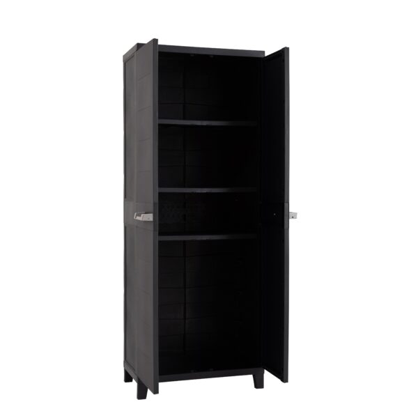De Toomax Prime opbergkast hoog is de perfecte oplossing voor het opbergen van kussens, tuinaccessoires en andere spullen in je tuin of in je garage. Deze stijlvolle en multifunctionele opbergkast biedt een combinatie van gebruiksgemak, duurzaamheid en een aantrekkelijk ontwerp. De opbergkast beschikt over een hangslotvoorziening zodat je de box volledig kan afsluiten. (hangslot niet meegeleverd). Deze opbergkast heeft met 3 plank waar je 15 kg op kunt plaatsen.