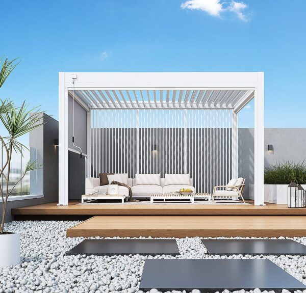 De Deluxe overkapping is een stijlvolle en praktische oplossing voor mensen die op zoek zijn naar een manier om hun buitenruimte te beschermen tegen de zon, regen. De Deluxe overkapping biedt een overdekte ruimte van 12 m². Daarnaast is deze pergola perfect geschikt als overkapping voor een lounge set, zwembad of spa. De overkapping kan ook dienen als carport voor een motor of auto. Hoogwaardige kwaliteit materialen. Bij Deluxe overkapping 300 x 400 is enkel gebruik gemaakt van hoogwaardige materialen. Zowel het frame als de lamellen zijn gemaakt van aluminium.