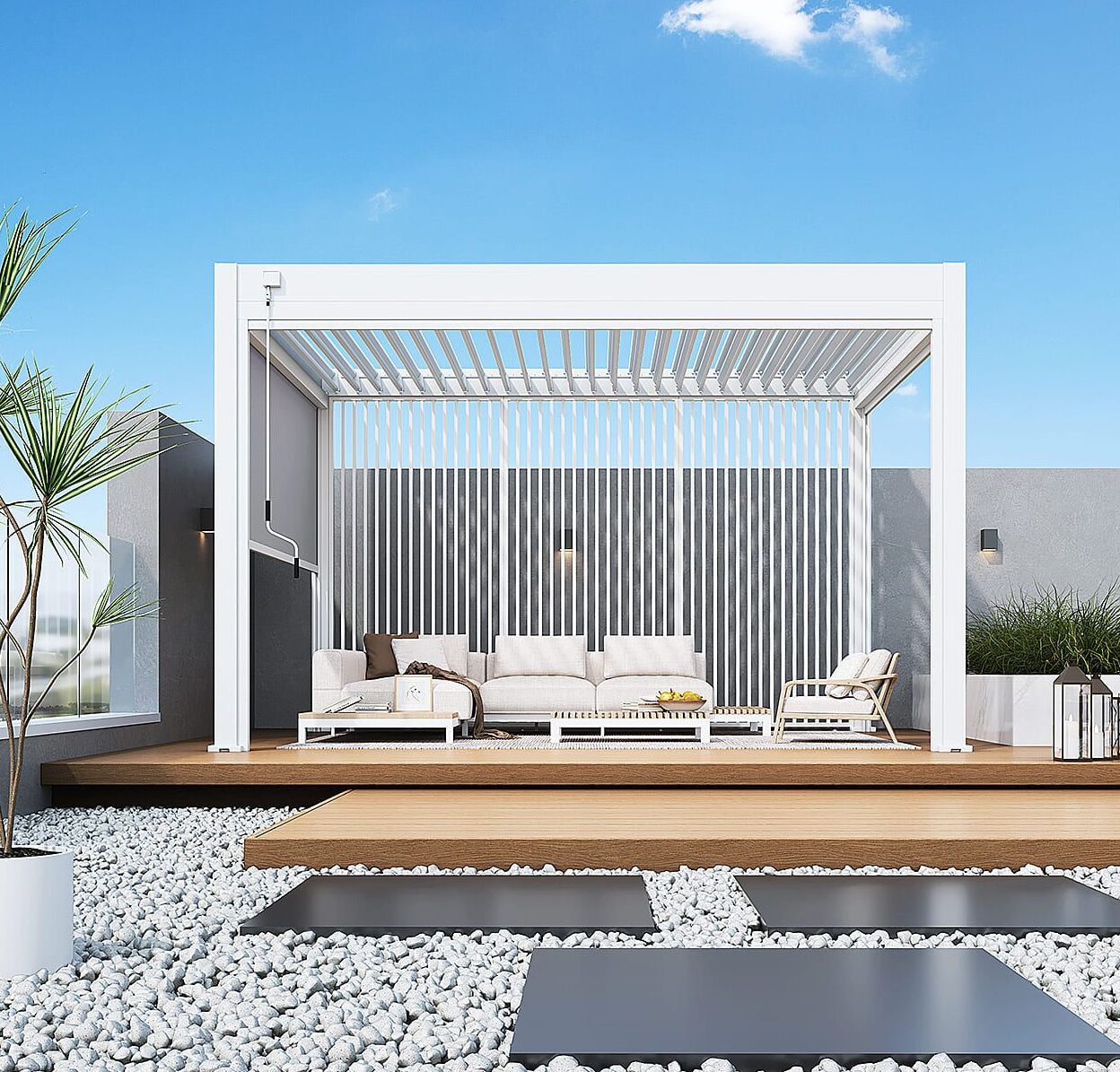 Je Deluxe overkapping uitbreiden met accessoires? Dat kan! Met het Pull Down Zijscherm of het Louvre Shutter paneel zit je heerlijk in de schaduw en beschut tegen de wind. Daarnaast zorgen deze accessoires ook voor meer privacy. Door het unieke ontwerp bevestig je het zijscherm en het paneel volledig geïntegreerd in jouw pergola.