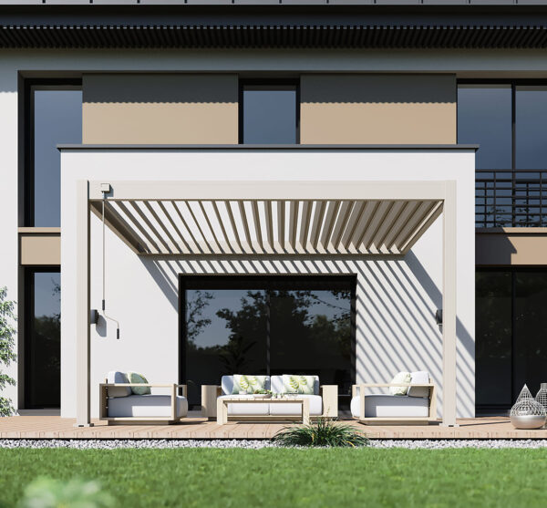 *Je Deluxe pergola 300 x 400 cm uitbreiden met accessoires? Dat kan! Met het Pull Down Zijscherm of het Louvre Shutter paneel zit je heerlijk in de schaduw en beschut tegen de wind.