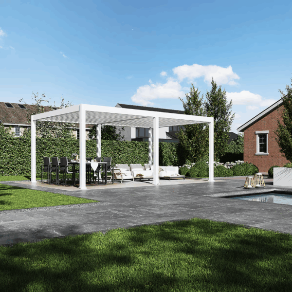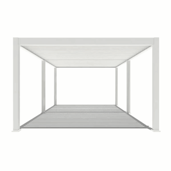 Premium, deze overkapping is met elektrisch lamellendak en LED – 400 x 600 cm – Wit. De Premium overkapping is een stijlvolle en praktische oplossing voor mensen die op zoek zijn naar een manier om hun buitenruimte te beschermen tegen de zon, regen. De Premium overkapping biedt een overdekte ruimte van 24 m². Daarnaast is deze pergola perfect geschikt als overkapping voor een lounge set, zwembad of spa. De overkapping kan ook dienen als carport voor een motor of auto.