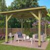 Wilt u goedkoop en een kant en klare  overkapping 340×340 cm kopen met alles erop en eraan? Deze Overkapping / Prieel Corfu, of ook wel tuinprieel te noemen, heeft een afmeting van 338 x 338 cm. Deze houten prieel bestaat uit glad geschaafd geïmpregneerd grenen hout en is daardoor weersbestending. Bovendien worden alle bevestigingsmateriaal meegeleverd bij dit model. Met dit houten prieel Corfu heeft u een mooie plek in de tuin om buiten te relaxen. Ook kunt u uw tuinmeubelen buiten laten staan zonder dat deze nat worden bij regen. Met een houten prieel beschermt u uzelf bovendien tegen zonlicht. Deze houten overkapping (of beter gezegd prieel) van 338 x 338 cm is erg geschikt om vrijstaand in uw tuin te plaatsen en daarin een zit of loungeruimte te maken.