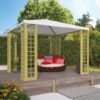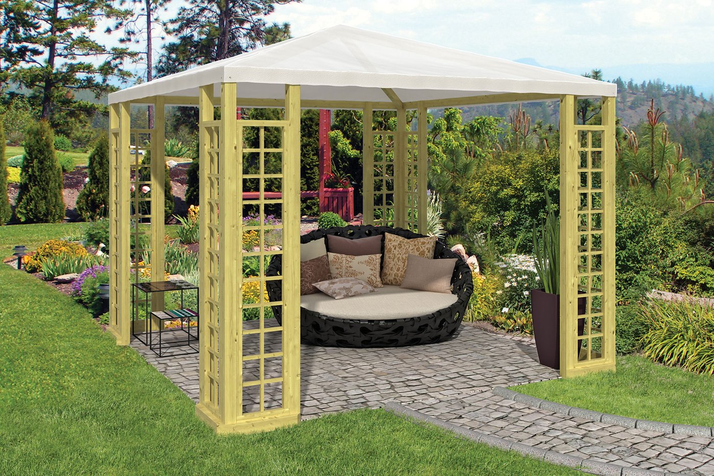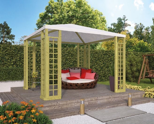 Het geïmpregneerde prieel Rhodos is bedekt met een wit zeildoek. Zowel het prieel als het witzeildoek zijn weersbestendig en stevig. Het mooie tuinprieel wordt geleverd inclusief smalle trellisschermen op de hoeken, en geven dit houten paviljoen een uniek karakter.