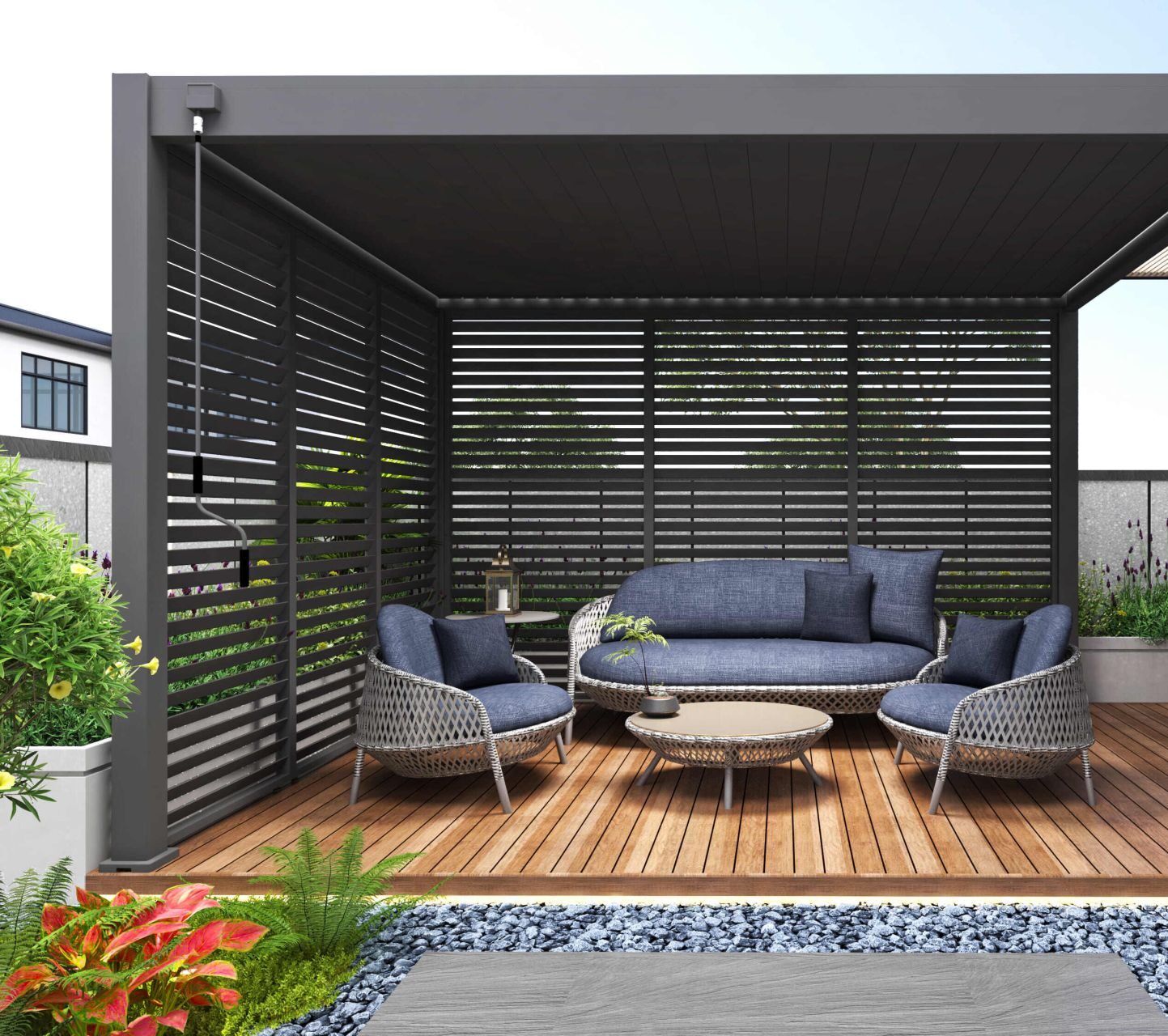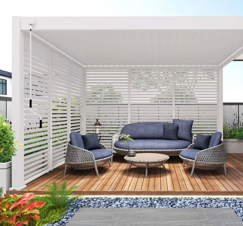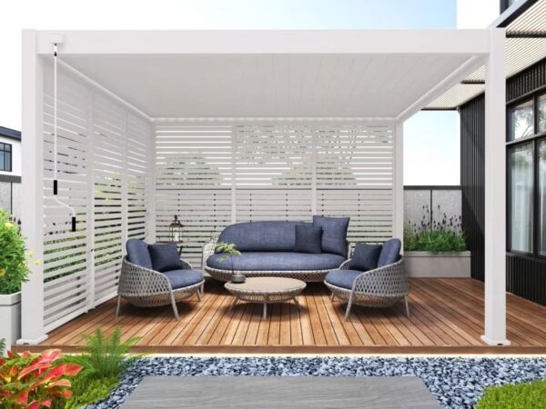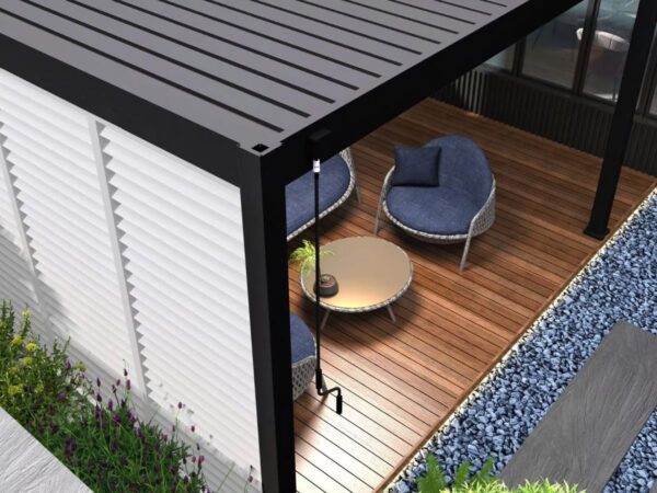 Door het unieke ontwerp bevestig je het zijscherm volledig geïntegreerd in jouw pergola. Met de meegeleverde handleiding is het monteren van het kantelbare shutter paneel zeer eenvoudig. Het paneel is gemaakt van aluminium. De panelen worden per stuk geleverd. Je hebt 3 panelen nodig om een kant van 4 meter volledig af te dekken. Deze panelen zij modulair. Dit houdt in dat je de panelen op elke kant kan plaatsen zoals je dit wilt.