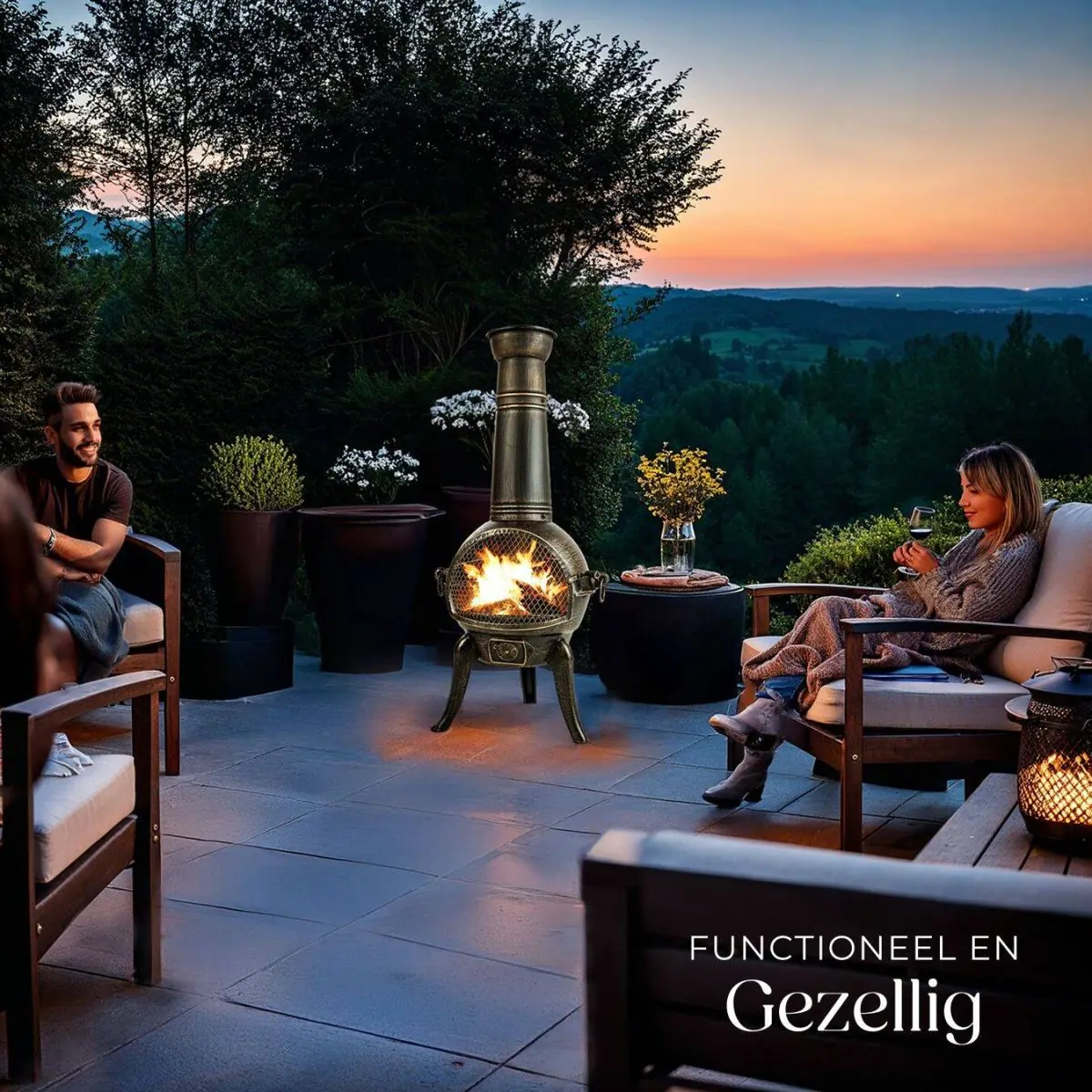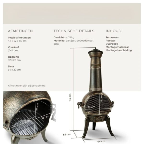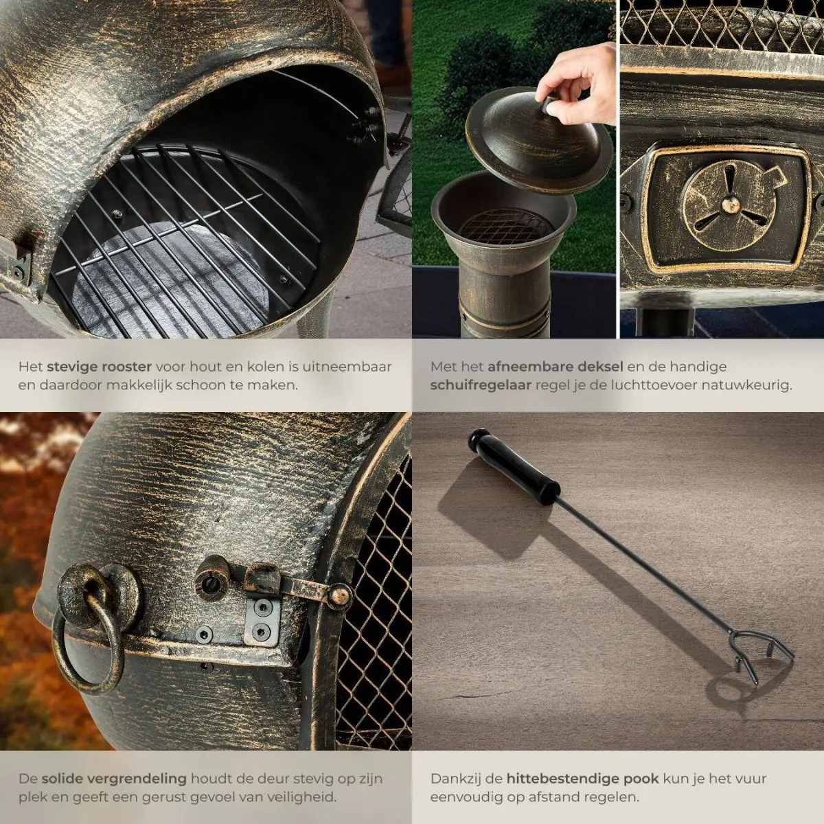 Gezelligheid op je terras! Deze prachtige terraskachel van HC Huis & Tuin wordt het hoogtepunt in je tuin. De tuinhaard is grotendeels vervaardigd uit gietijzer en heeft een stijlvolle antieke look. Ook ideaal te gebruiken als terrashaard. Aan de voorkant kan de haard via de gaasdeur met hout worden gevuld. Het gaas beschermt tegen vonken. Daarnaast is de haard uitgerust met een grillrooster en een bijbehorende pook met houten handvat. Haal vandaag nog aangename warmte in huis voor ontspannen momenten in de tuin!
