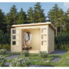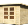 De keteldruk impregnering van de vloerbalken beschermt de vloerbalken tegen weersinvloeden en houtafbraakschimmels. Met zijn royale afmetingen en massief houten frame zorgt de praktische en voor gemonteerde deur voor een gemakkelijke toegang tot het tuinhuis en beschermt hij daarnaast de inhoud effectief tegen onbevoegde toegang. De beglazing van de lichtopeningen zorgt voor een royale daglichtinval.
