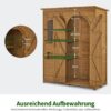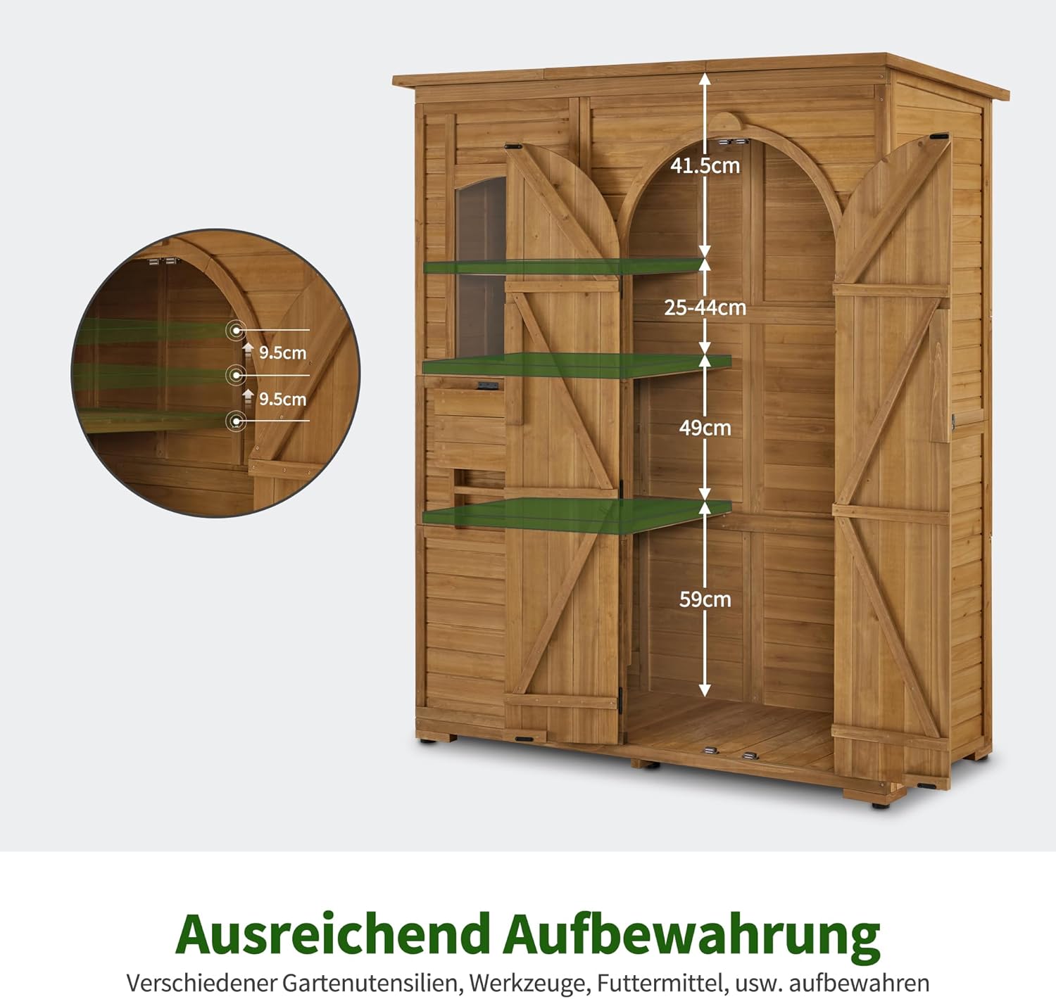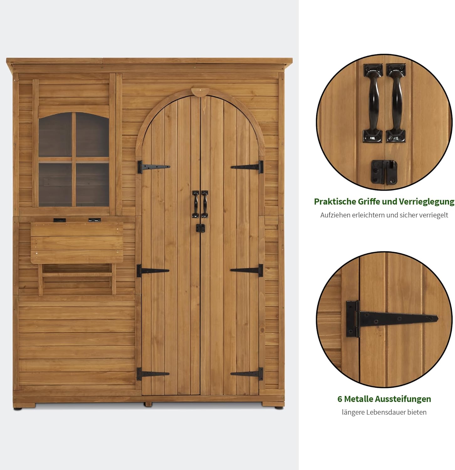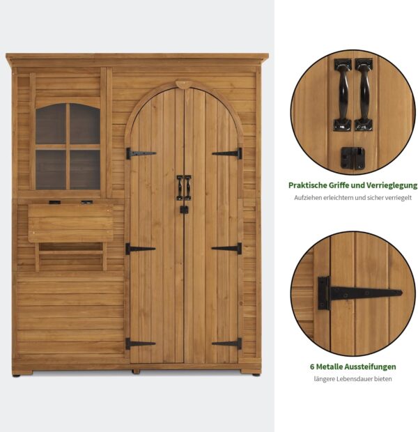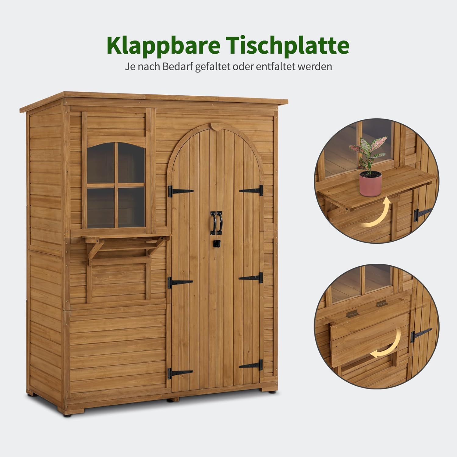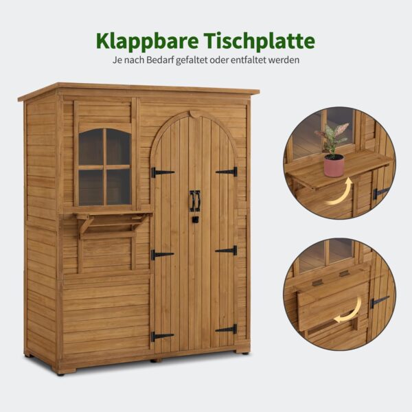 Inklapbaar tafelblad: de houten tuinkast heeft een uitklapbare tafel, ideaal als tijdelijke werktafel voor kleine gereedschappen, bloempotten en andere voorwerpen, in de tuin of elders