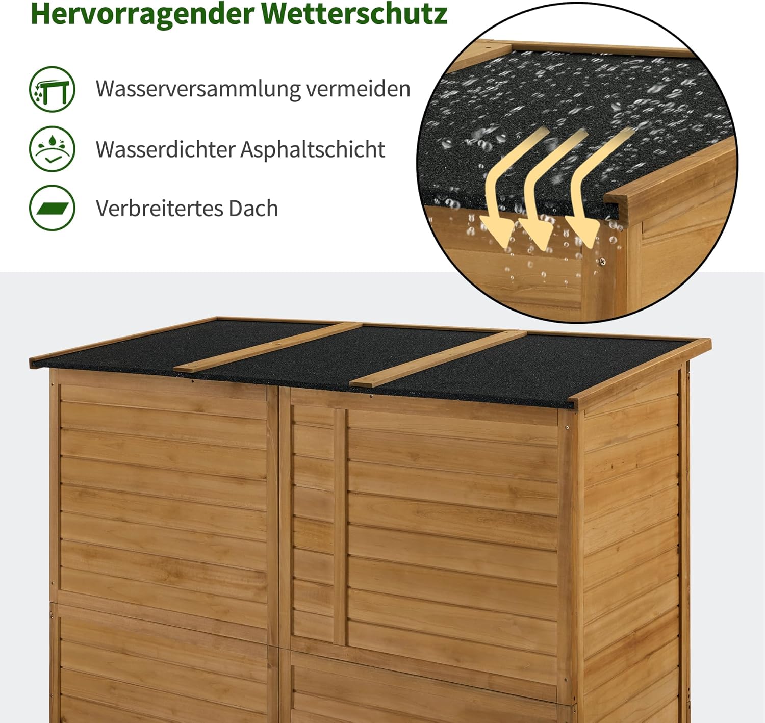 Uitstekende bescherming tegen weersinvloeden: het hellende dak van de tuinkast is bedekt met bitumenbanen, die de tuinkast beschermen tegen uv-straling en ophoping van regenwater; het houten huis is perfect geschikt voor buiten, bijv. tuin, balkon, terras