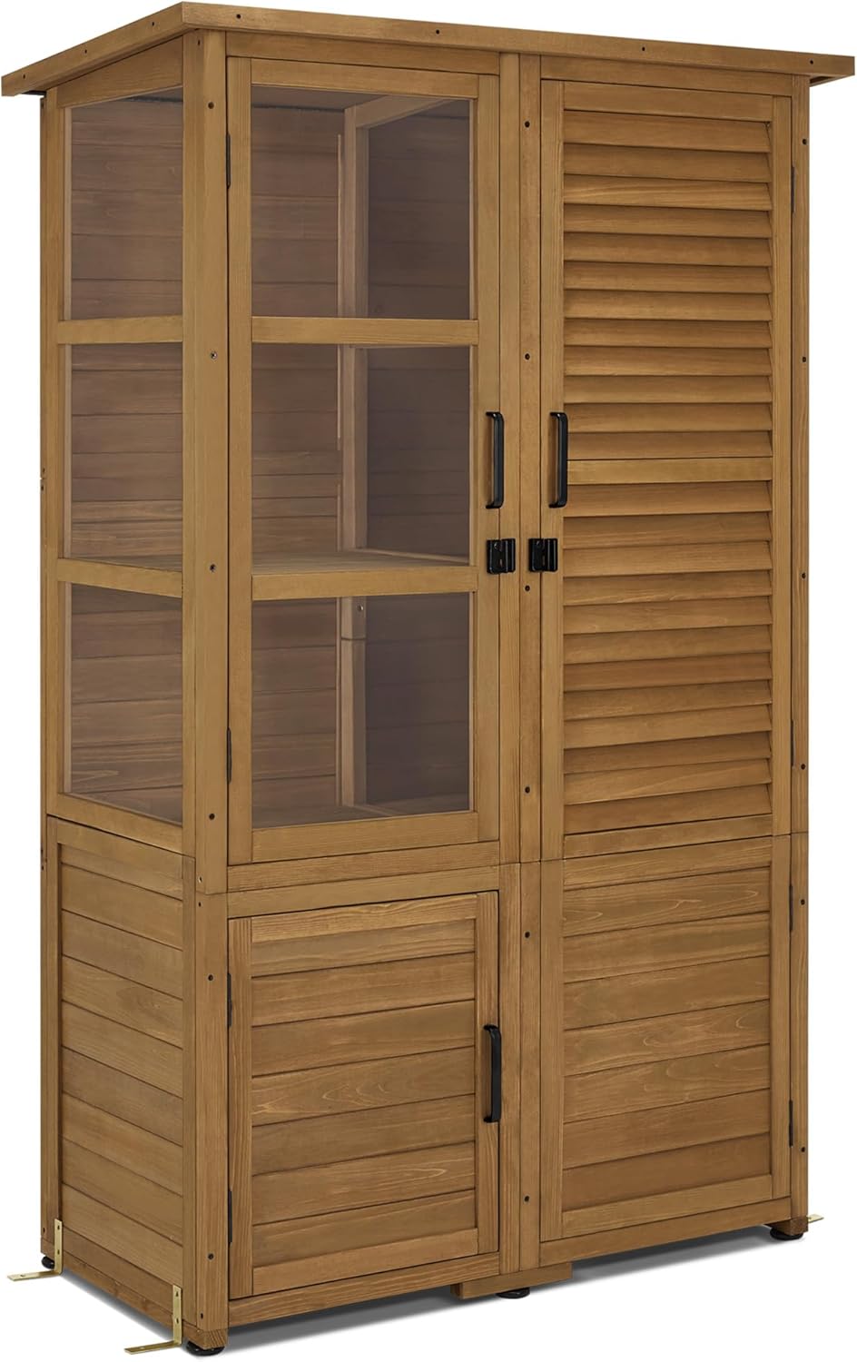 Doordachte deurcombinatie: een stabiele jaloeziedeur links voor optimale luchtcirculatie en vocht controle; een transparante acryl deur rechtsboven biedt volledig overzicht van de planken en laat daglicht door, evenals een praktische aparte deur rechtsonder voor snelle toegang tot het vak voor kleine onderdelen