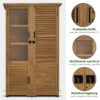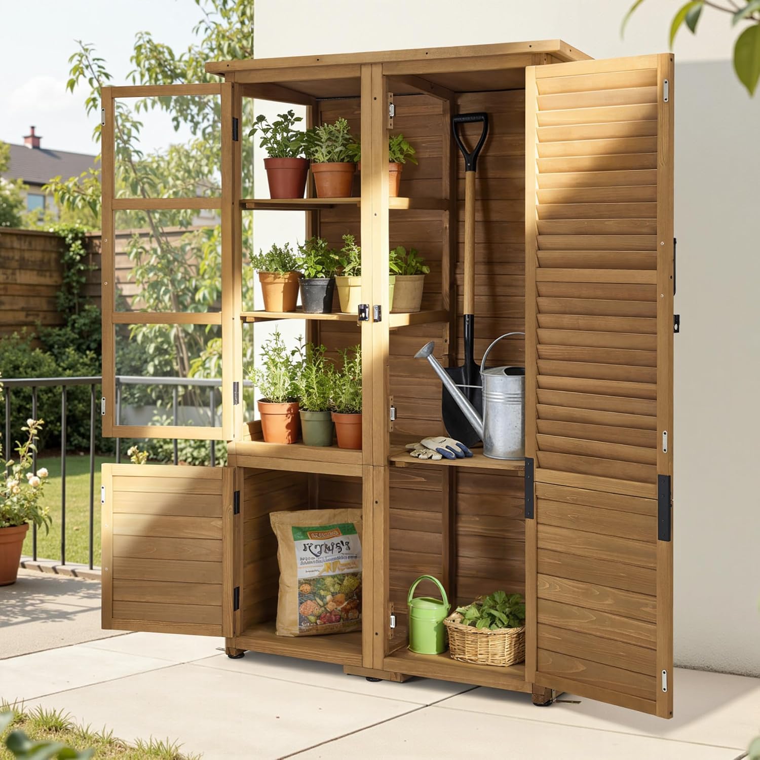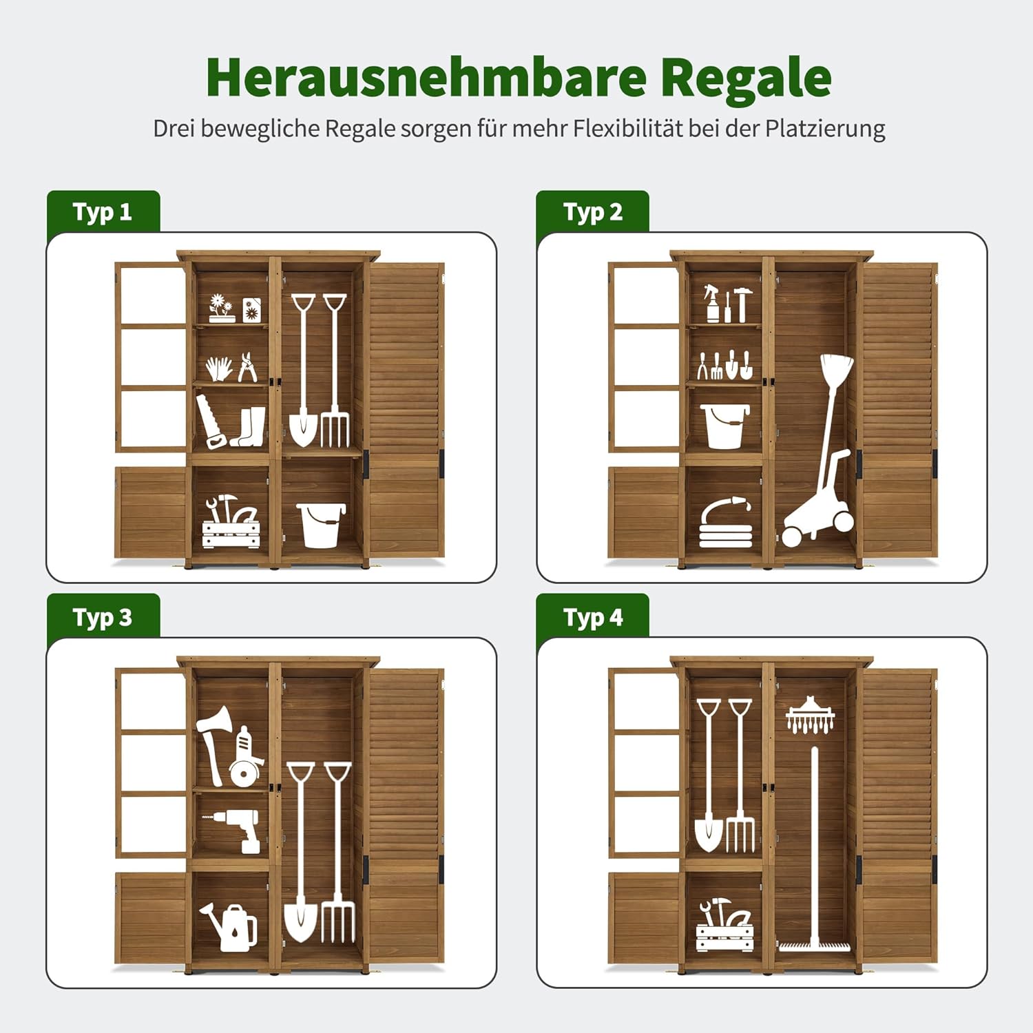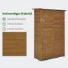 Doordachte opbergruimte: de tuinschuur biedt maximaal aanpassingsvermogen door 3 flexibele, uitneembare planken (46 x 45 cm), die elk 15 kg kunnen dragen; het apart toegankelijke vak rechtsonder creëert ideale opbergruimte voor vaak benodigde kleine gereedschappen (totale afmetingen: 55 × 110 × 175 cm)