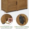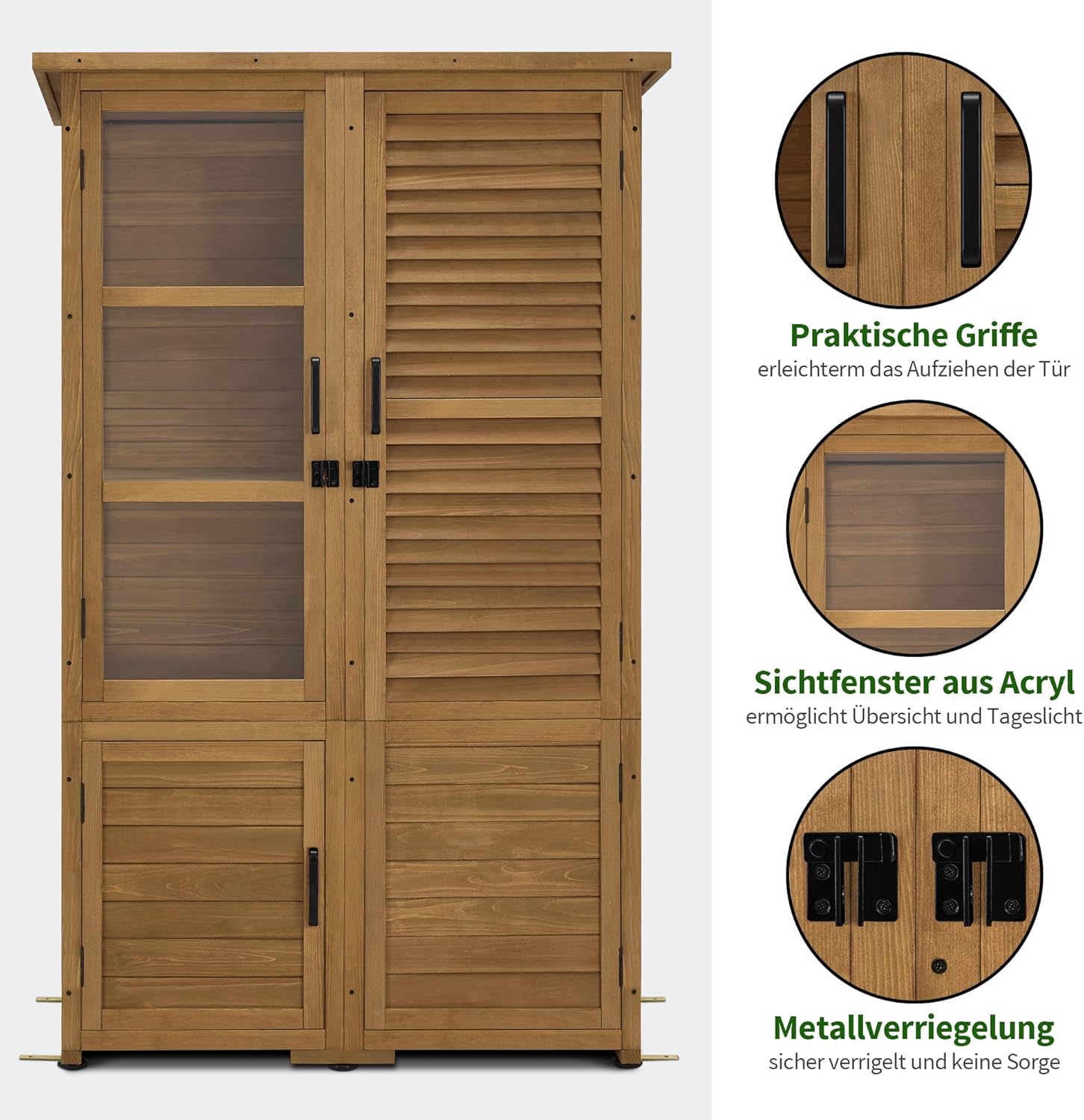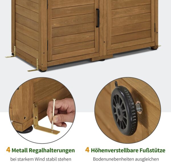 Veiligheid en duurzaamheid: de weerbestendige buitenkast heeft 2 kantelbeveiligingen en 4 plankhouders voor stabiliteit; de 4 in hoogte verstelbare voetsteunen compenseren oneffenheden in de grond; 2 metalen sluitingen zorgen voor een veilige sluiting