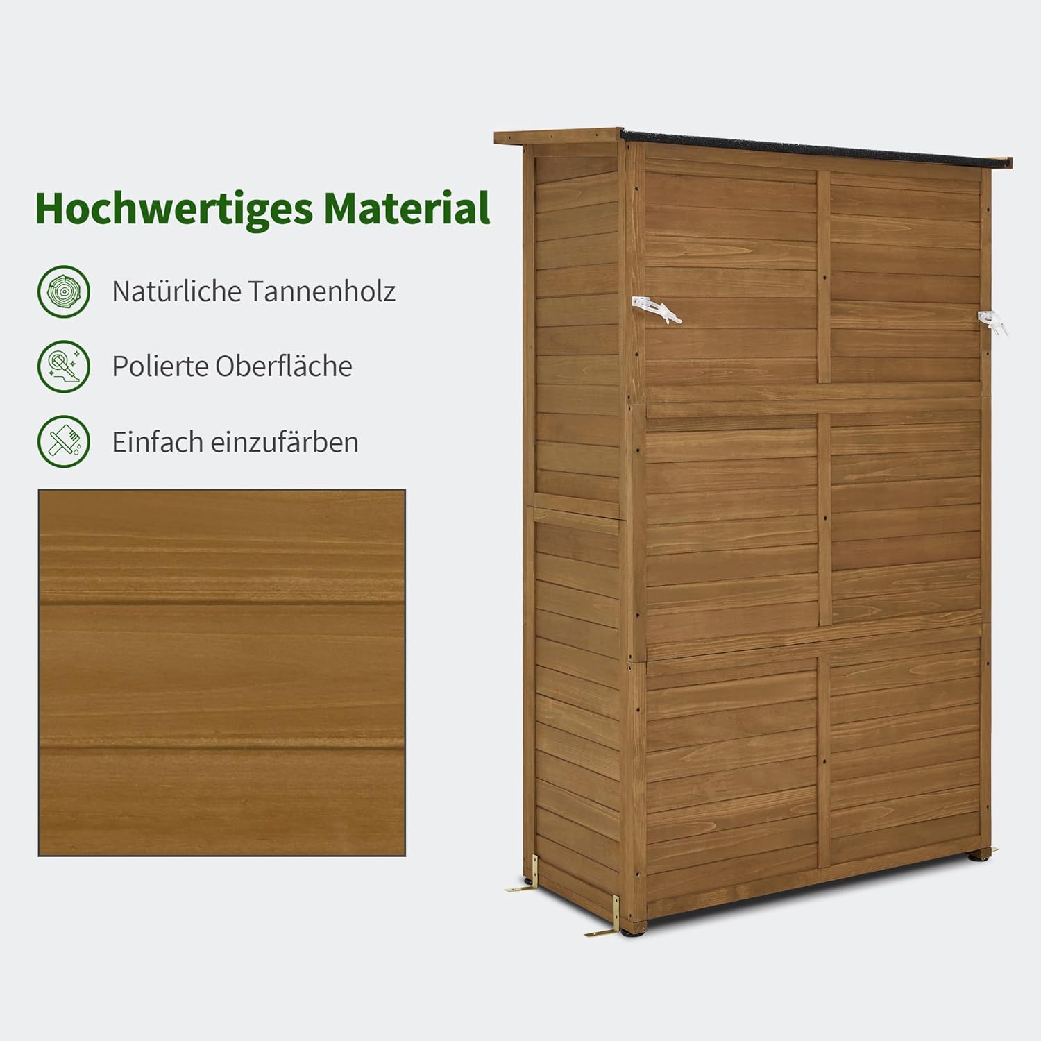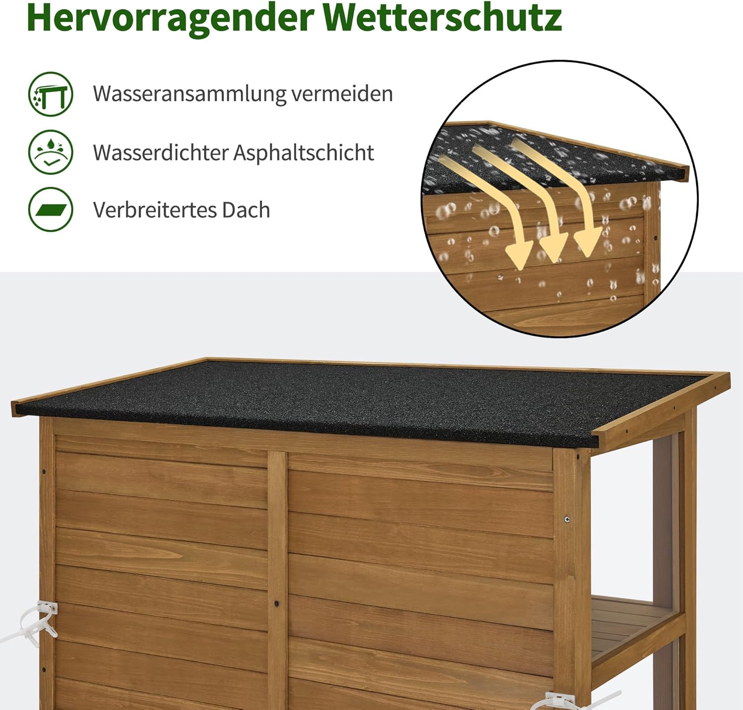 Uitstekende bescherming tegen weersinvloeden: het tuinhuisje is bedekt met hellend asfaltdak dat uv-stralen en waterophopingen voorkomt, waardoor het tuinhuisje ideaal is voor gebruik buitenshuis