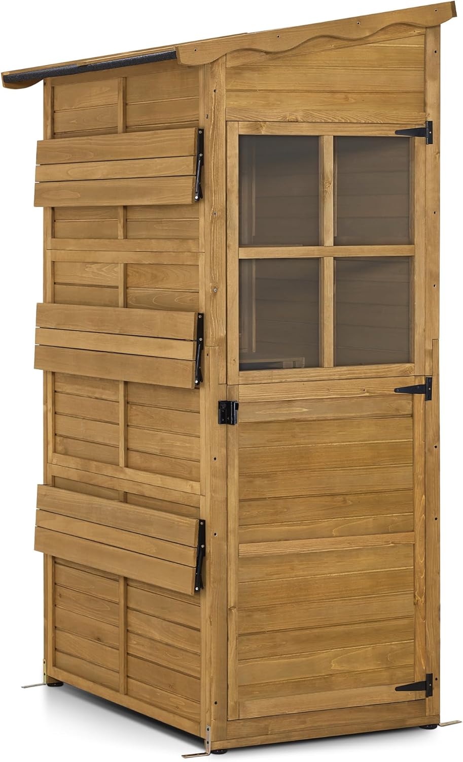 Ruime binnenruimte: Dankzij de ruime, beloopbare binnen ruimte kunt u de tuinkast betreden en uw gereedschappen gemakkelijk organiseren; met 3 vaste planken biedt de buitenkast een praktische opbergoplossing voor uw tuingereedschappen (binnen afmetingen: 104×65×187 cm)