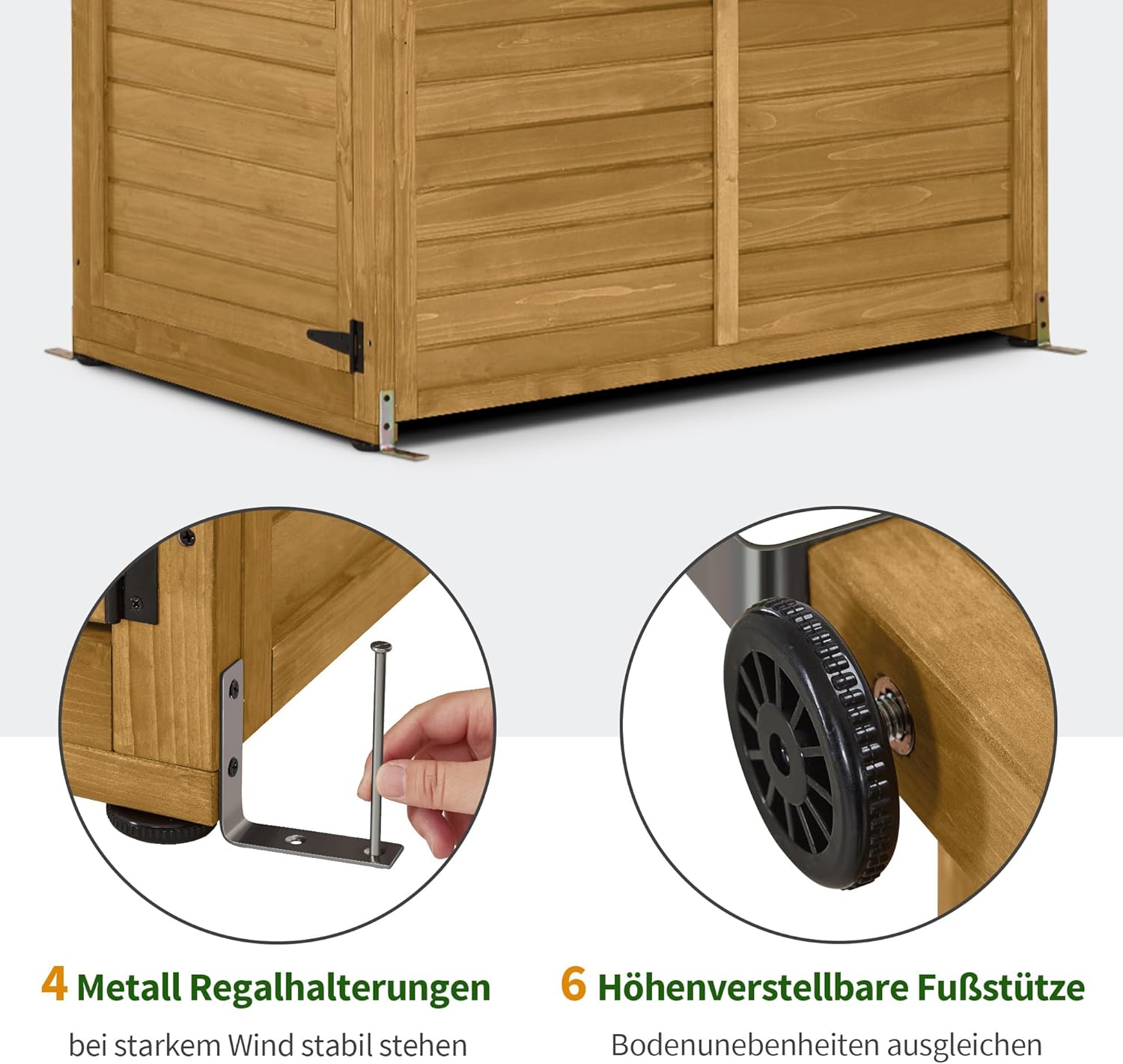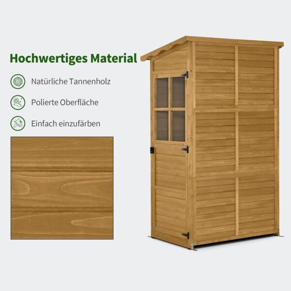 Uitstekende bescherming tegen weersinvloeden: het tuinhuisje is bedekt met een neer gekanteld asfalt dak, dat uv-stralen en waterophoping voorkomt; de verbrede dakrand beschermt de deur tegen regen, waardoor de gereedschapsschuur ideaal is voor gebruik buitenshuis