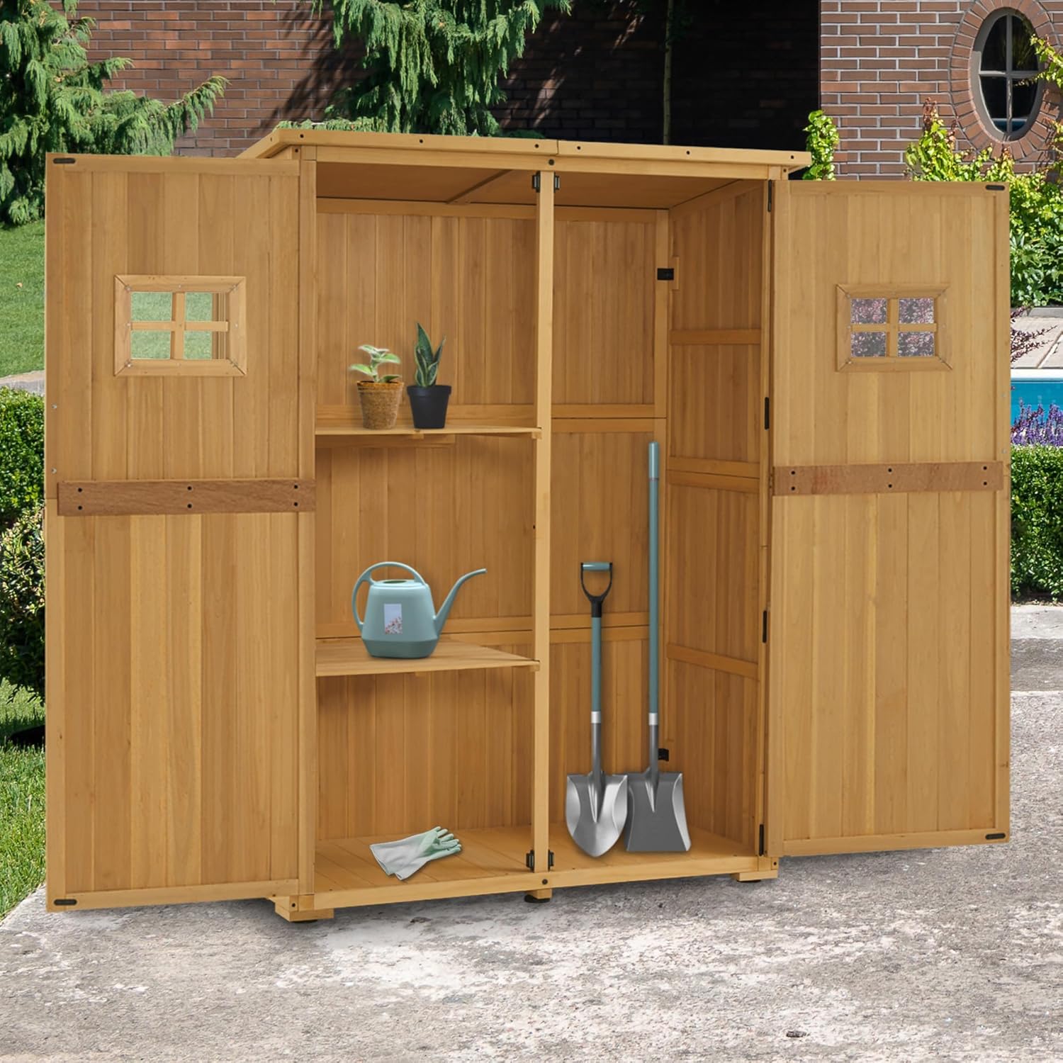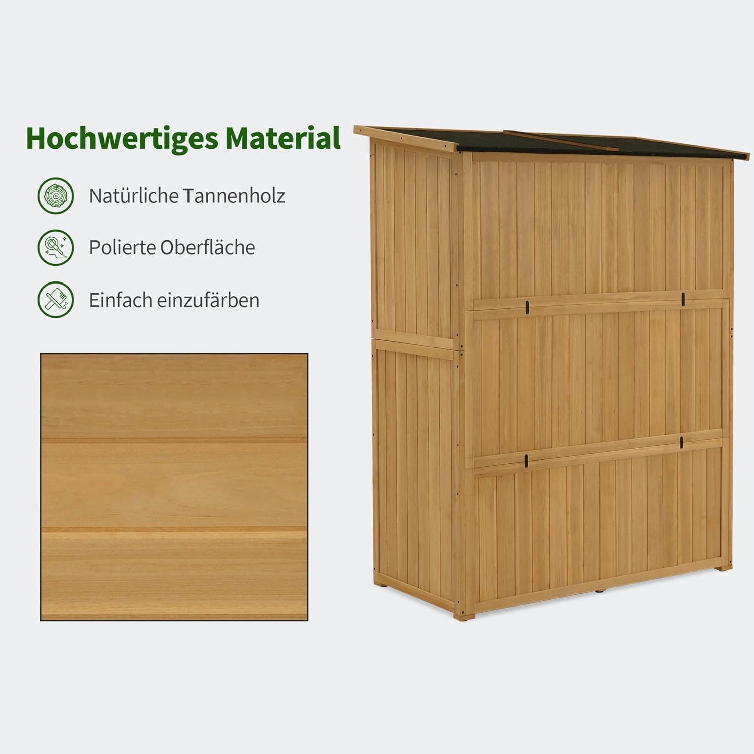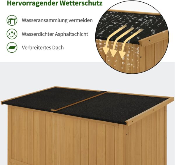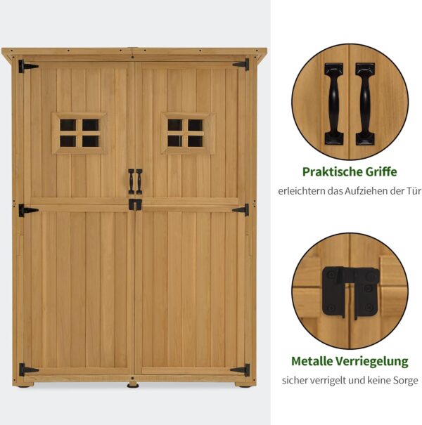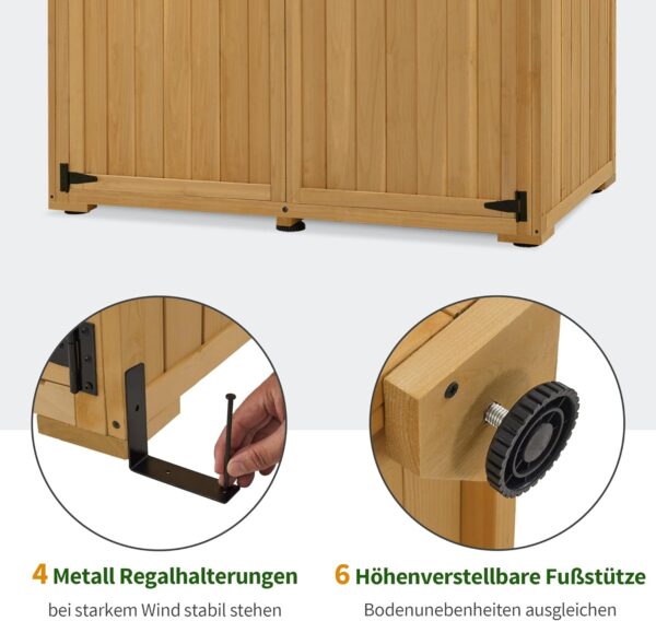 Multifunctionele opbergruimte: De linkerkant van de balkonkast is perfect voor groot tuingereedschap; aan de rechterkant van de terraskast bevinden zich 2 planken voor kleiner plantgerei of kinderspeelgoed; Totale afmetingen: 90×55×169 cm; Elk bord kan maximaal 15 kg dragen