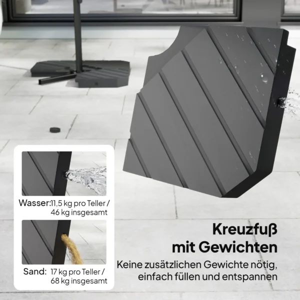 ✔ Een kruisvoet en vier vulbare gewichten zijn inbegrepen voor een complete, stabiele opstelling, ideaal voor je nieuwe parasol