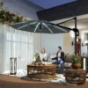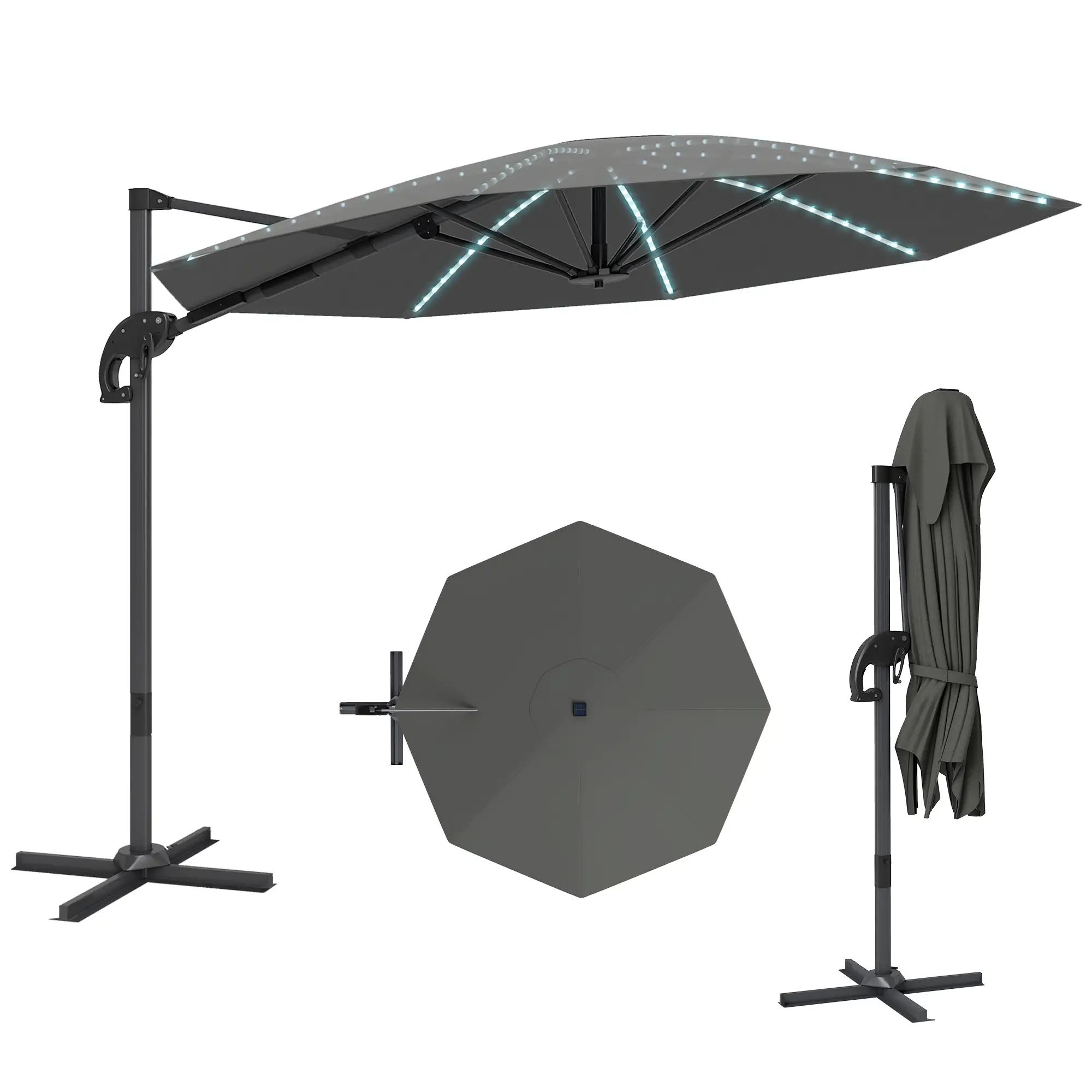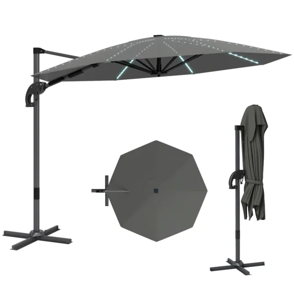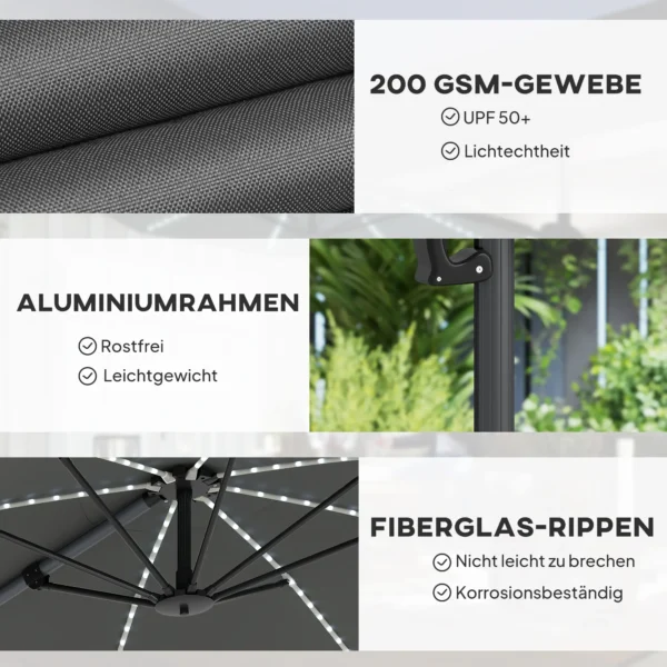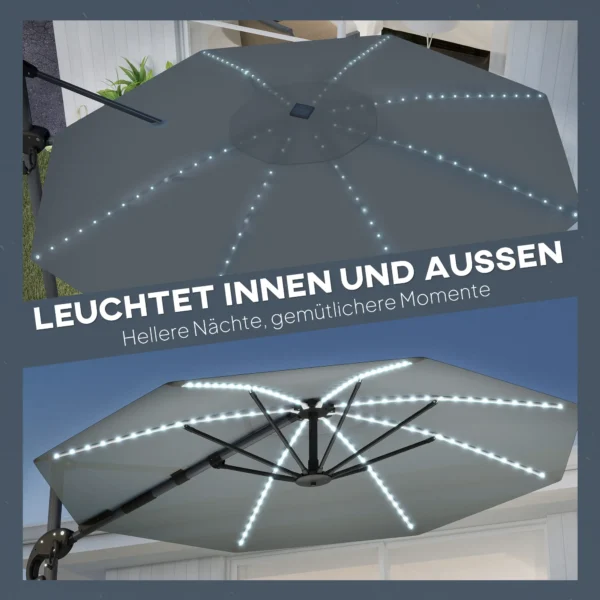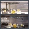 Parasol met verlichting: Verlicht je avonden met zeven koperen draad lichtketens die in de steunstangen zijn geïntegreerd, opgeladen via een zonnepaneel en USB. Met instelbare helderheid en een gemakkelijk toegankelijke schakelaar op de kantelbalk kun je gezellige gesprekken voeren onder de sterren.